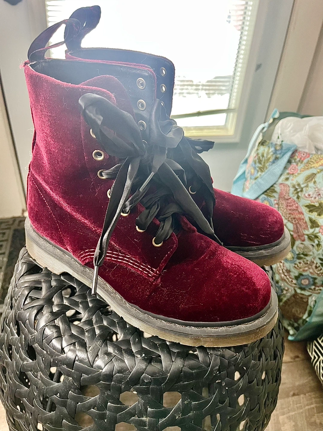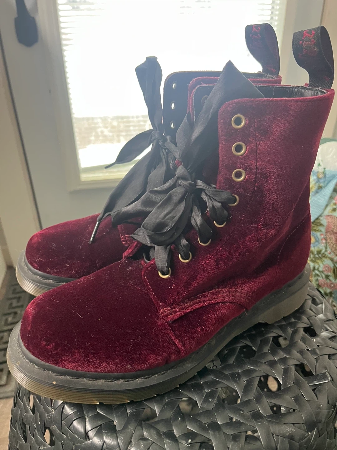 These rare boots are the Dr. Martens 1460 Pascal Velvet 8-Hole Boots in the "Cherry Red" colorway. This specific model is part of their vegan line, crafted from high-quality, animal-friendly velvet. Size in the photos.
