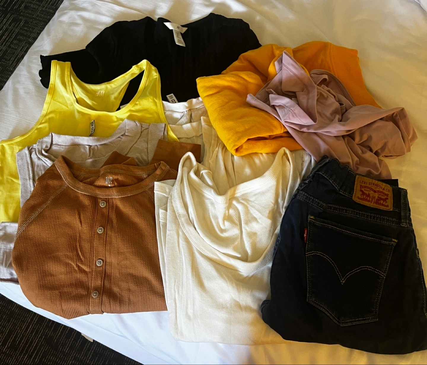 Sizes S and M, a mixed lot of clothing including items from H&M, GAP, and Levi's. There's a variety of tops and a pair of Levi's jeans included. All items are in good used condition and ready for a new home!