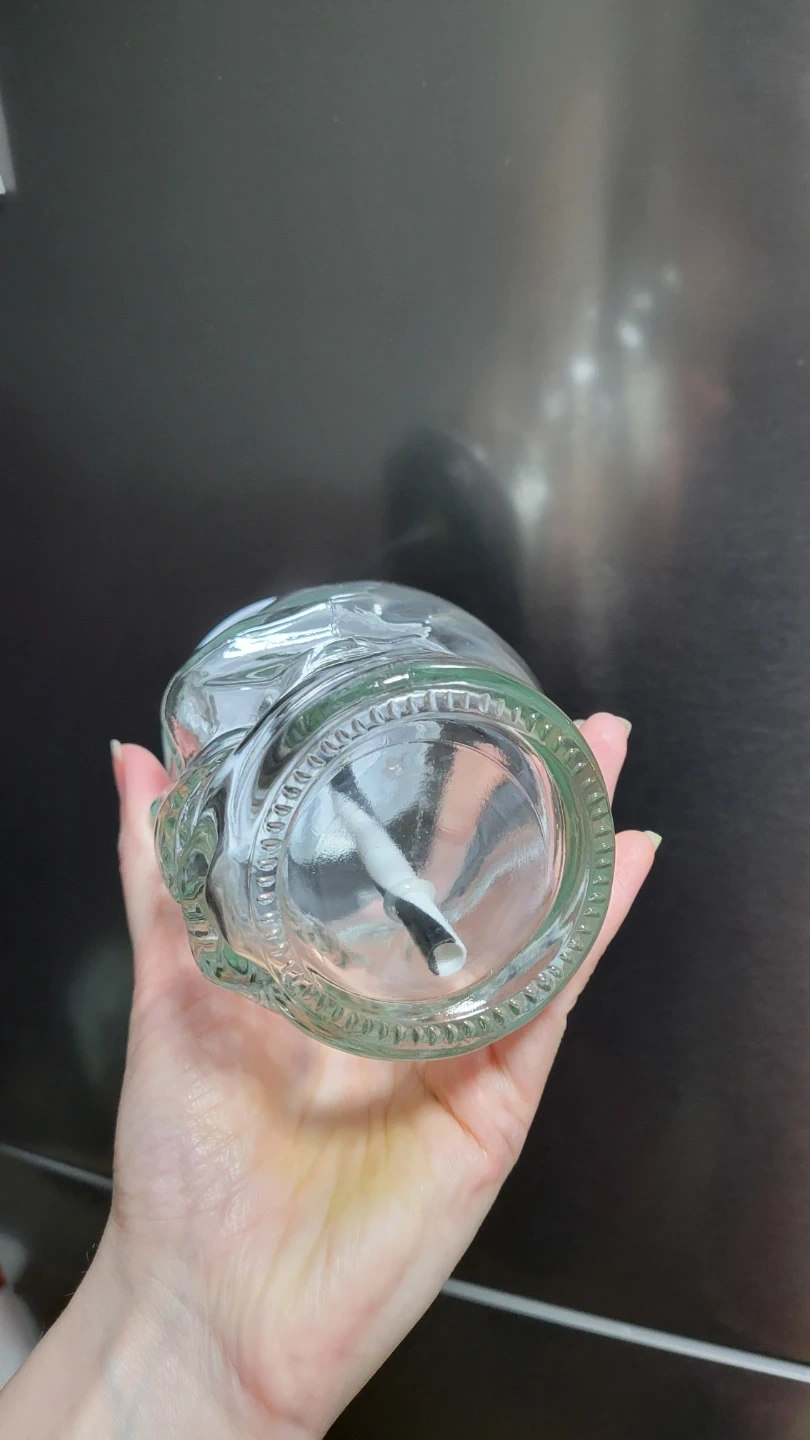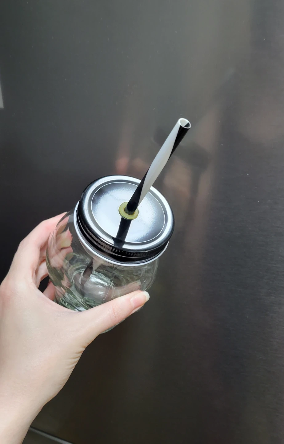 A clear glass jar shaped like a skull. It comes with a black lid and a black and white striped straw. This unique mug is great for Halloween parties or everyday use!