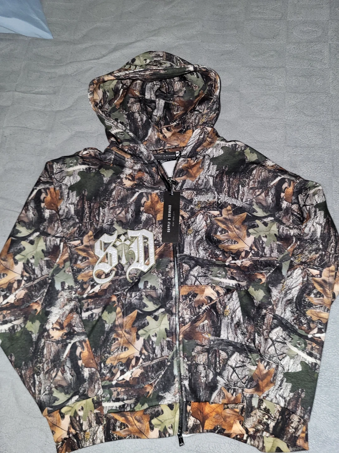This Supply & Demand zip-up hoodie features a realistic camouflage pattern. It's made with a comfortable fabric blend, perfect for casual wear. The hoodie includes a full zipper closure and a drawstring hood. Pick up only