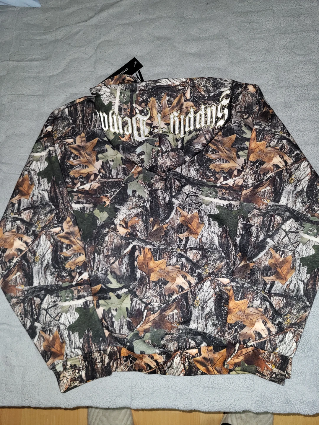 This Supply & Demand zip-up hoodie features a realistic camouflage pattern. It's made with a comfortable fabric blend, perfect for casual wear. The hoodie includes a full zipper closure and a drawstring hood. Pick up only