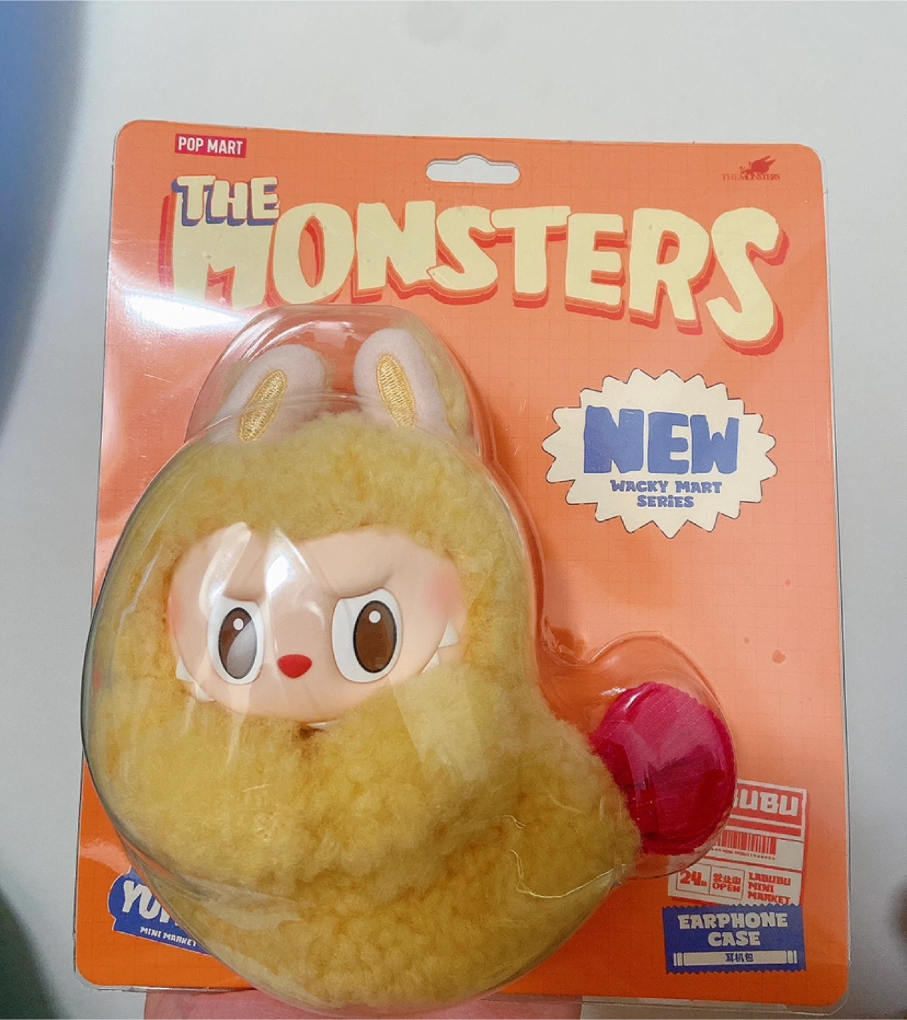 This is a new Pop Mart The Monsters Wacky Mart Series earphone case. It's designed for earphones and features a fuzzy yellow character. It's made of silicone and PVC.