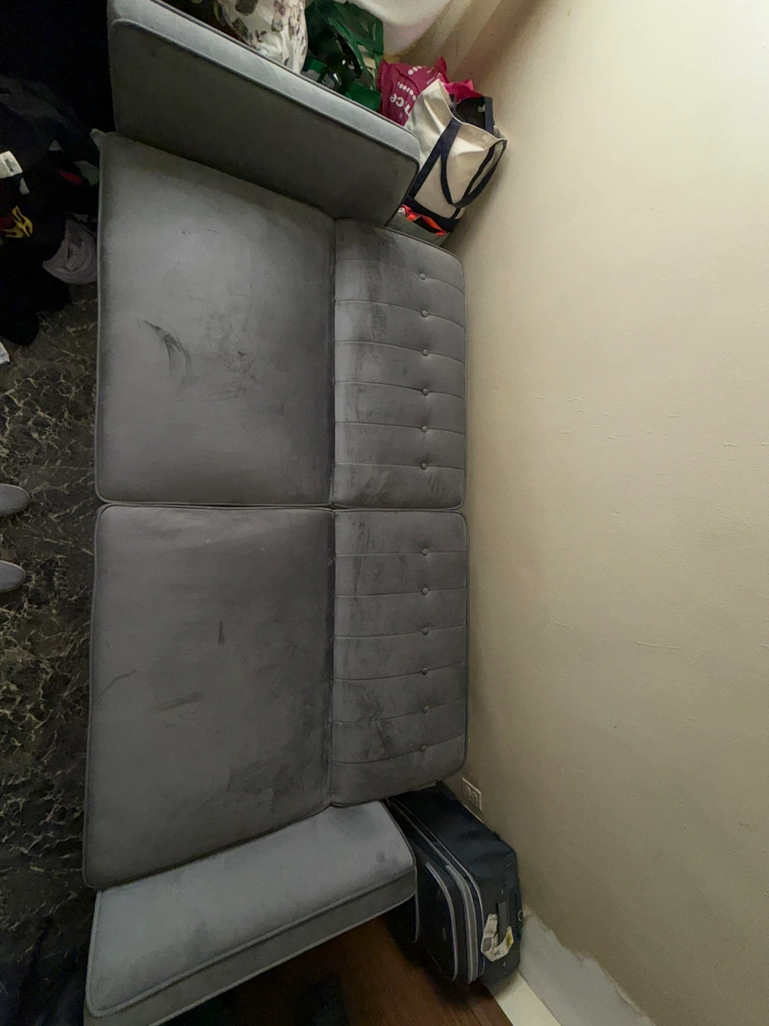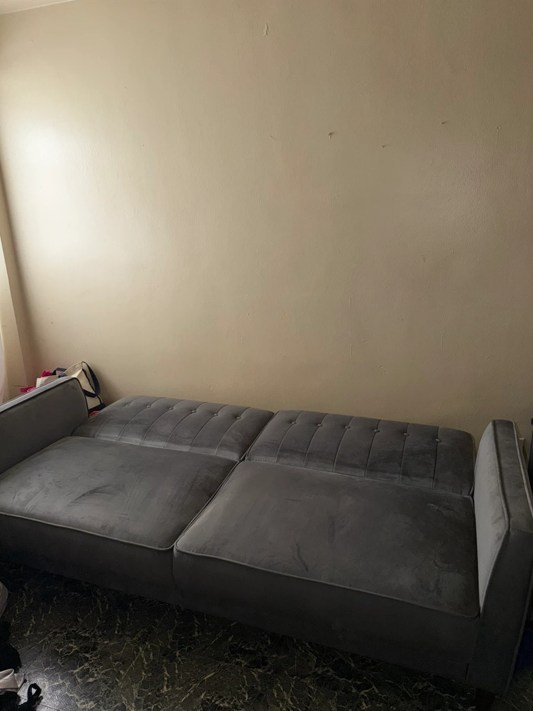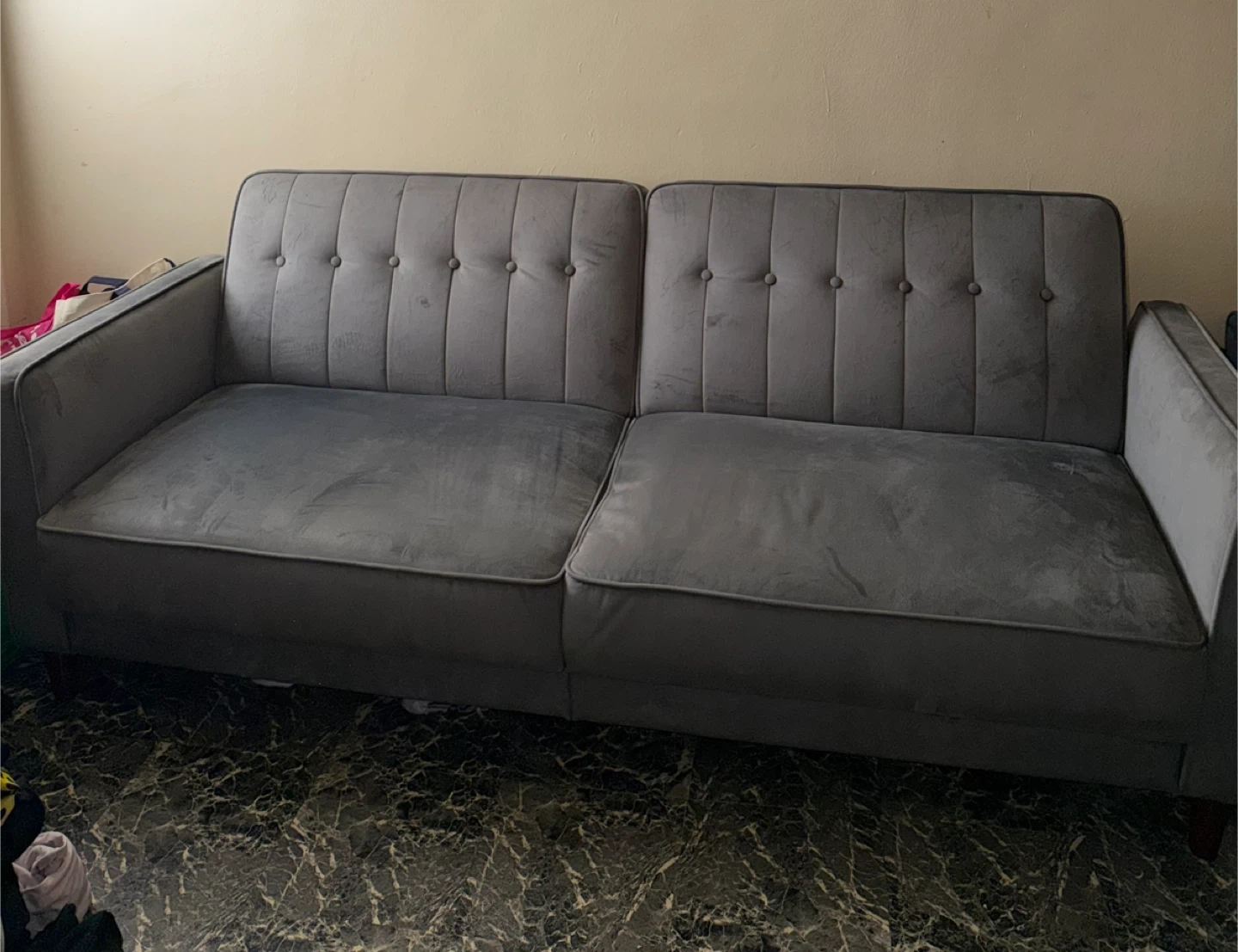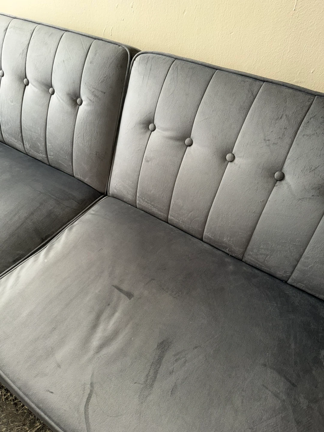 Gray velvet sofa bed with tufted back cushions. It's a modern style futon that easily converts to a sleeping surface. Seats up to three people.