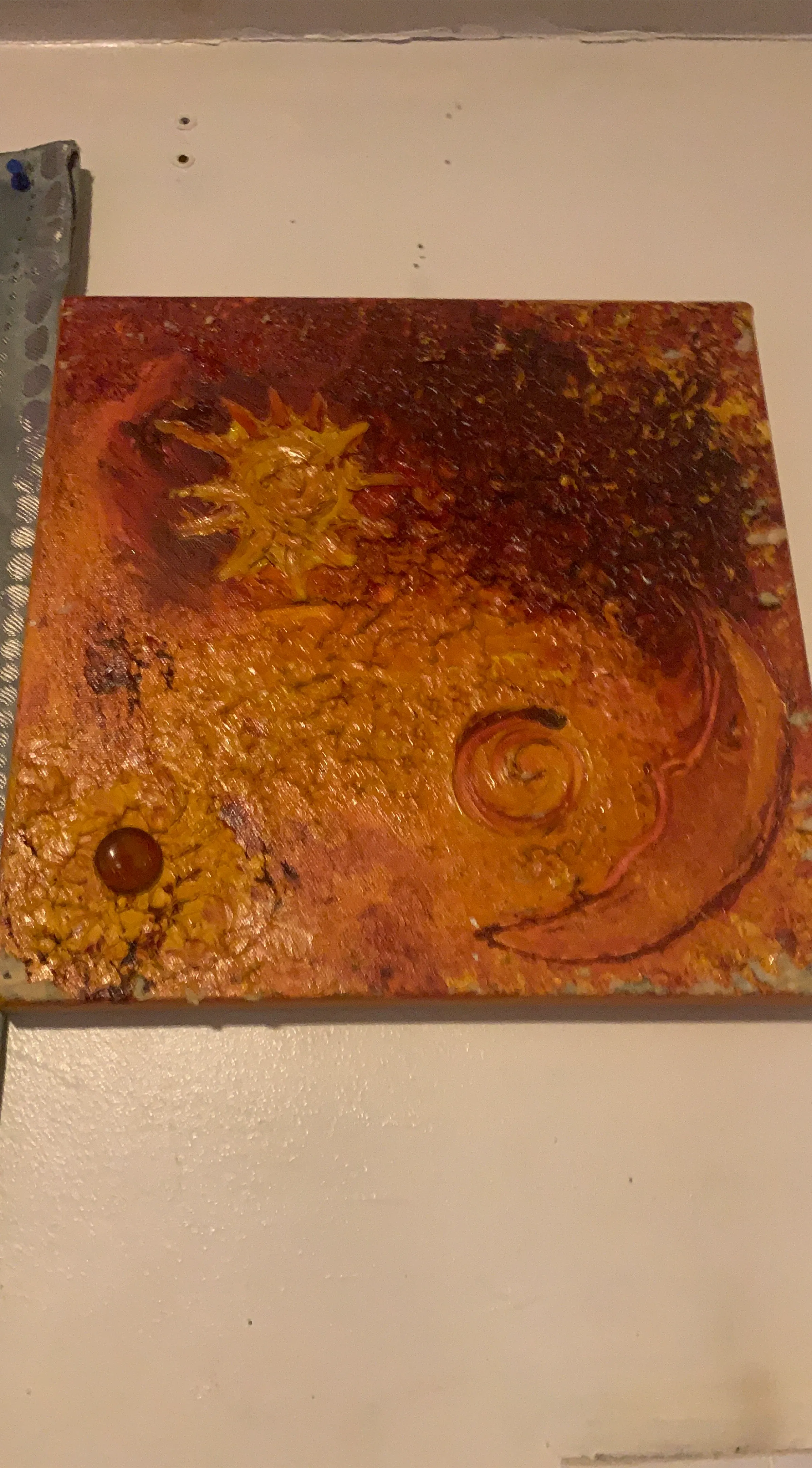 Textured square art piece featuring a prominent sun and crescent moon design. The artwork uses warm, fiery colours like orange and red with a raised, tactile finish. A single brown bead is attached to the lower left portion of the art.