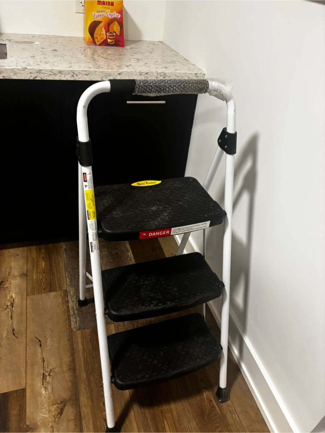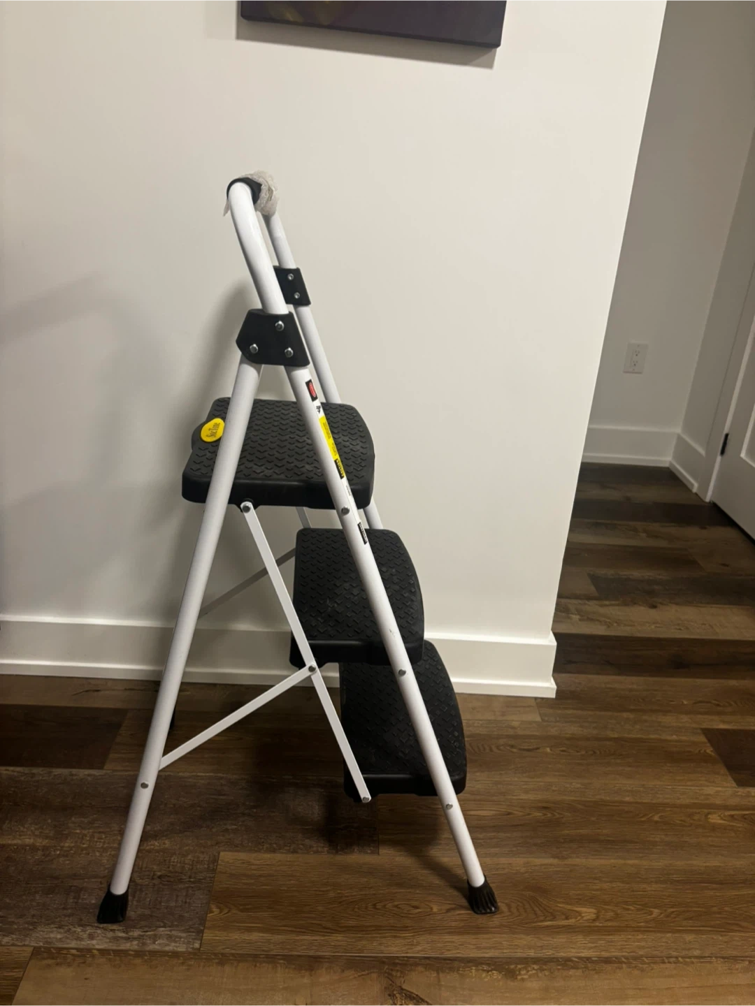 A white 3-step folding step stool. It's made with a metal frame and has anti-slip treads on each step. This stool folds flat for easy storage. Handy for reaching higher shelves or tasks around the house!