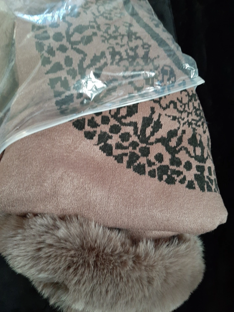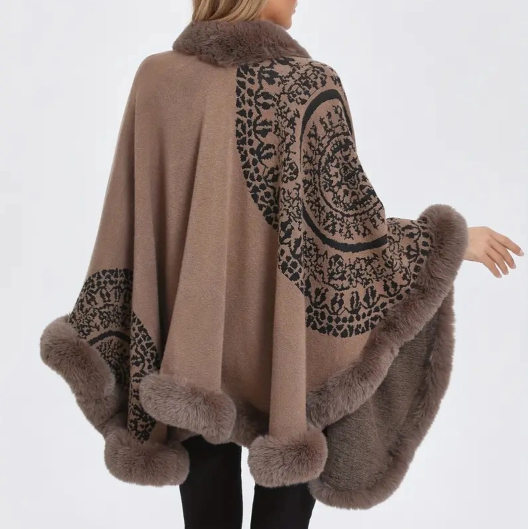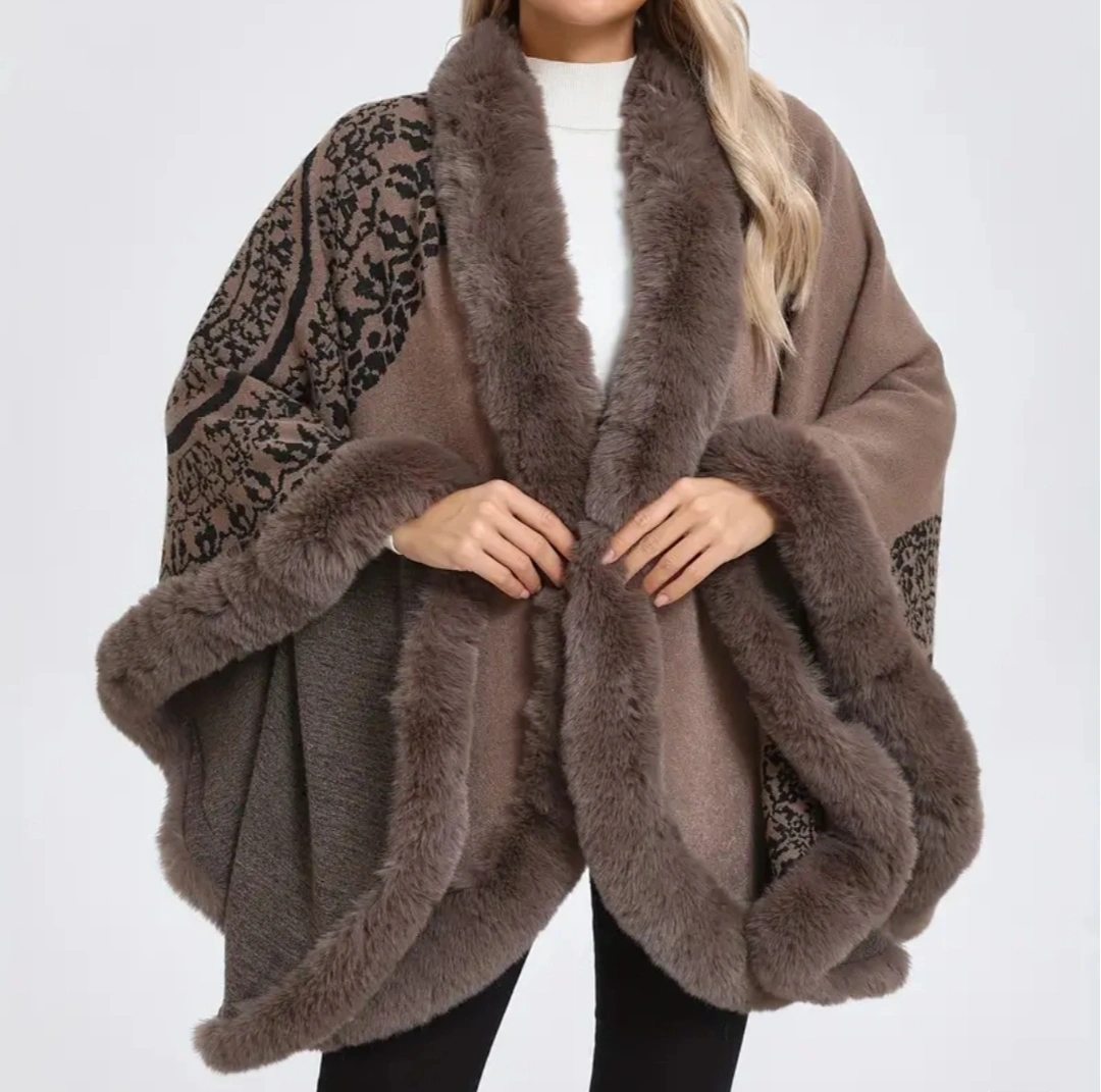This is a beautiful brown knitted cape with a faux fur collar and trim. The cape is very soft and warm, and perfect for the winter. It is a very versatile piece of clothing suitable for Fall and Winter