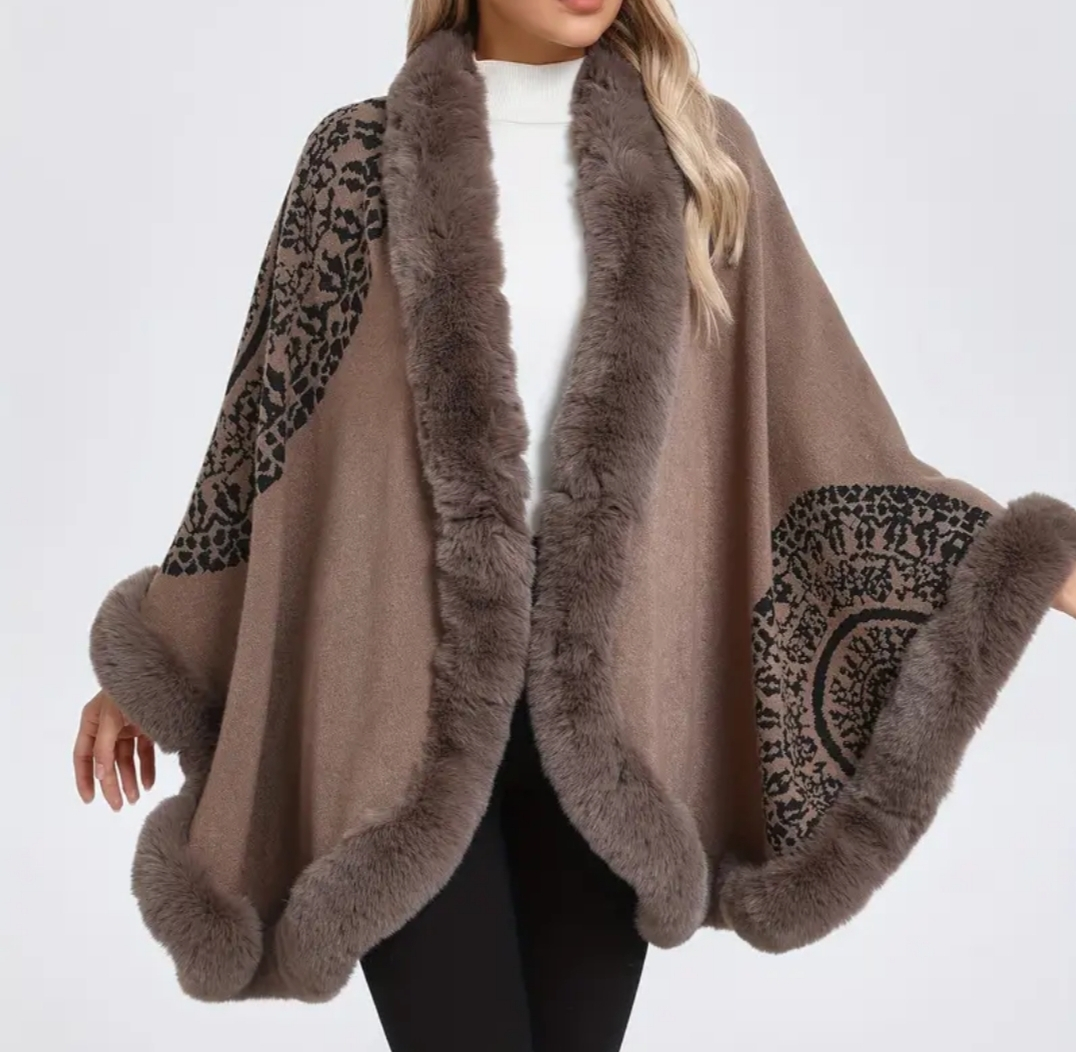 This is a beautiful brown knitted cape with a faux fur collar and trim. The cape is very soft and warm, and perfect for the winter. It is a very versatile piece of clothing suitable for Fall and Winter