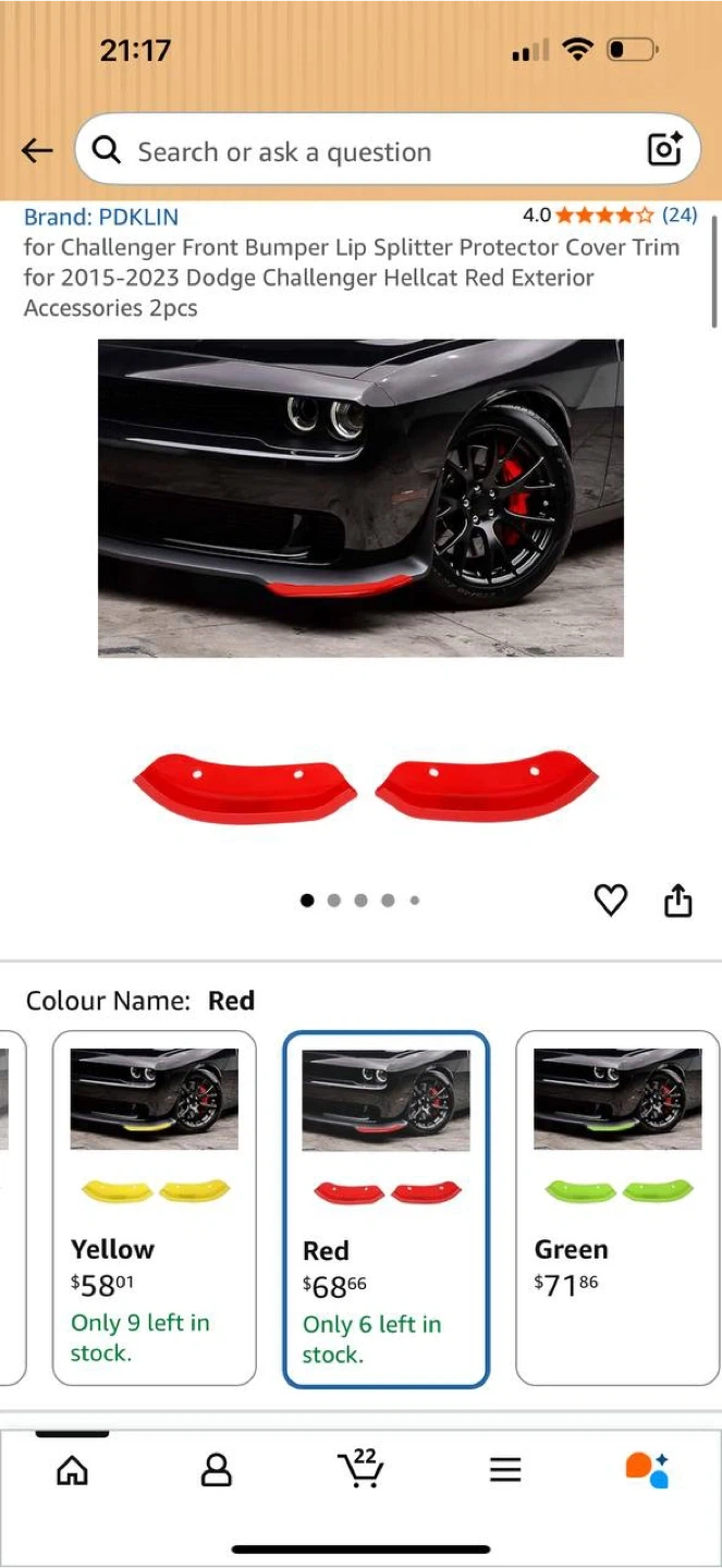 πŸ”₯ PDKLIN Front Bumper Lip Splitter Protectors – Dodge Challenger 2015-2023 (Red) – NEW πŸ”₯ πŸ’₯ Brand: PDKLIN πŸ’₯ Condition: NEW πŸ’₯ Color: Red πŸ’₯ Set includes 2 pcs πŸ’₯ Front bumper lip splitter protectors πŸ’₯ Sport / Hellcat style exterior upgrade βœ… Compatible with: β€’ Dodge Challenger 2015–2023 Perfect for protecting front lip from scratches while adding aggressive look. πŸ’² Price: $50 CAD πŸ“ Kitchener / Waterloo πŸš— Pickup preferred ‼️ FINAL SALE ‼️