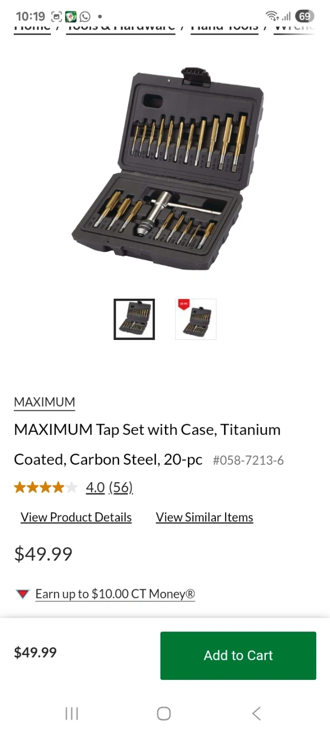 This is a 20-piece MAXIMUM tap set. It's made of titanium coated carbon steel and comes with a case. This set is great for threading tasks.