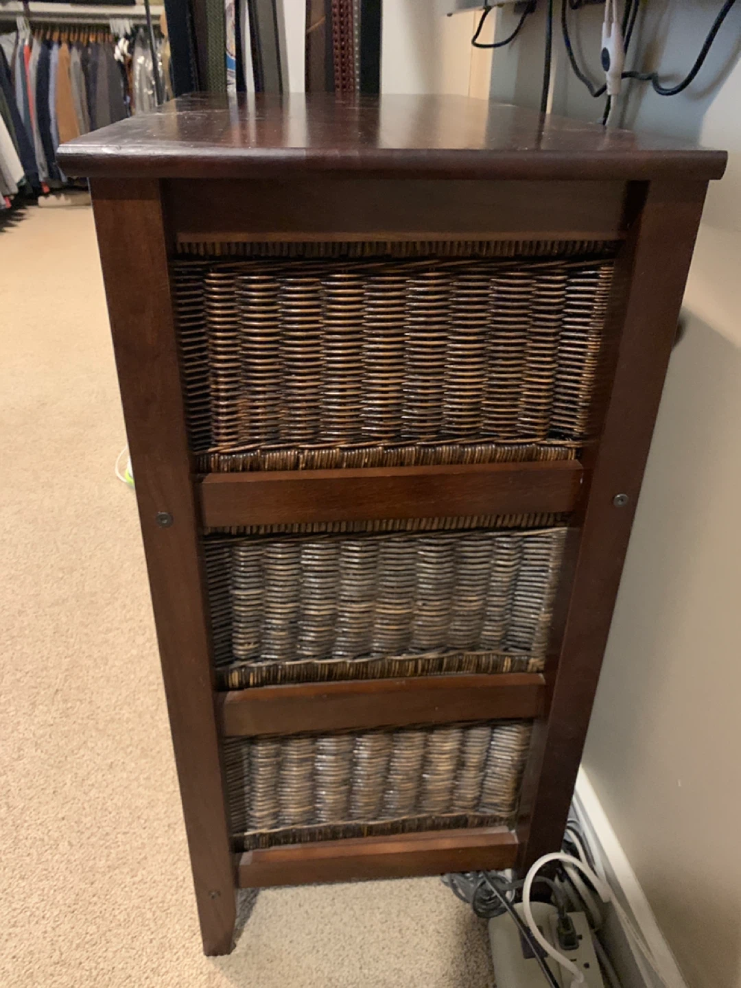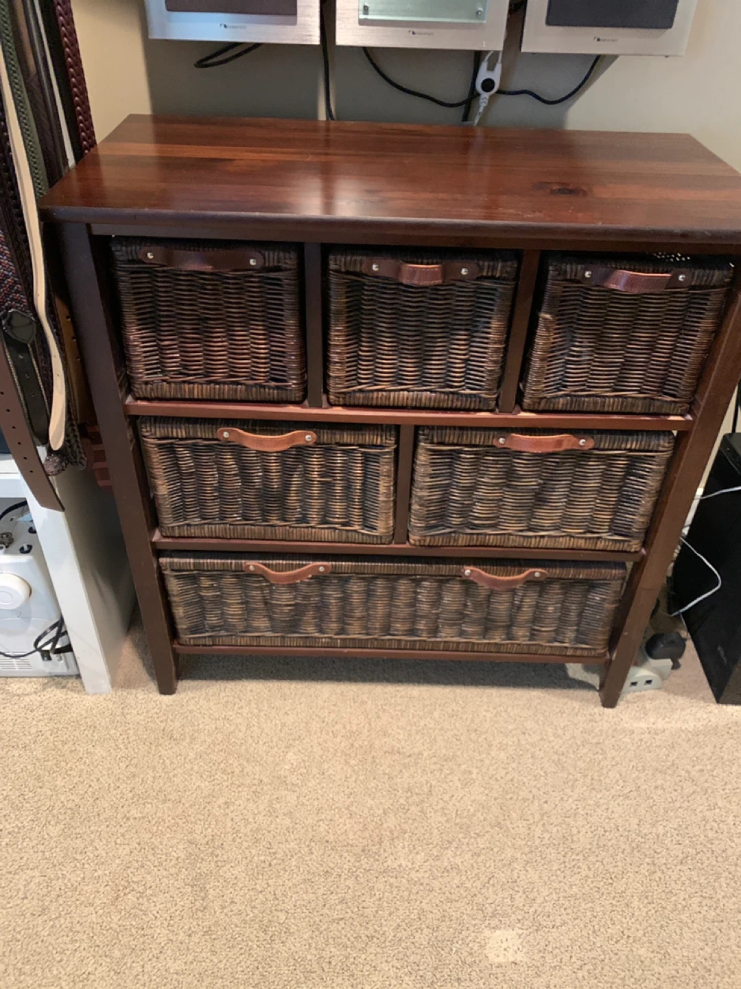 A dark wood chest of drawers featuring multiple wicker baskets with leather handles. It's suitable for organizing clothing or linens. This piece would work well in a bedroom or closet.