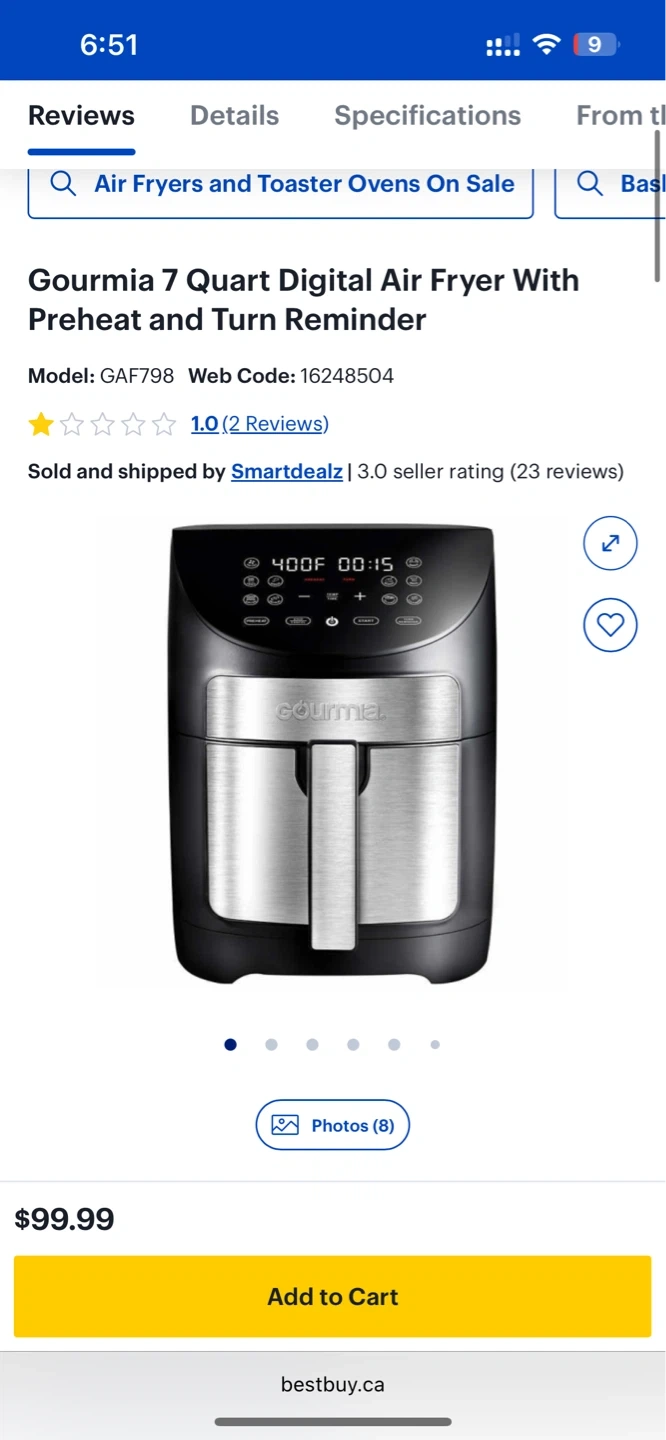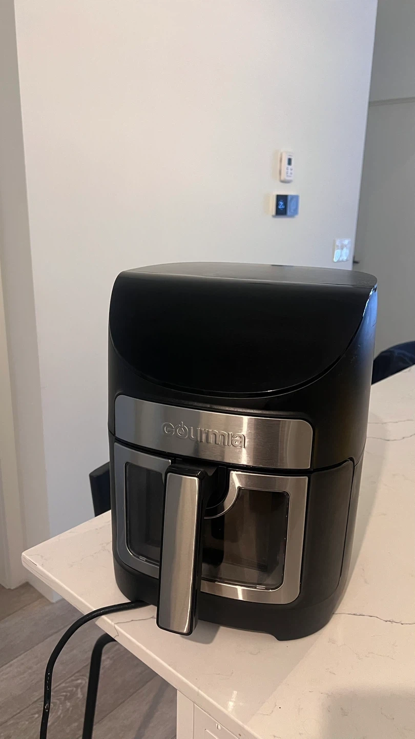 Gourmia digital air fryer with a 7-quart capacity. Includes a turn reminder function for consistent cooking. The unit is black with stainless steel accents. It's great for quick meals and snacks!
