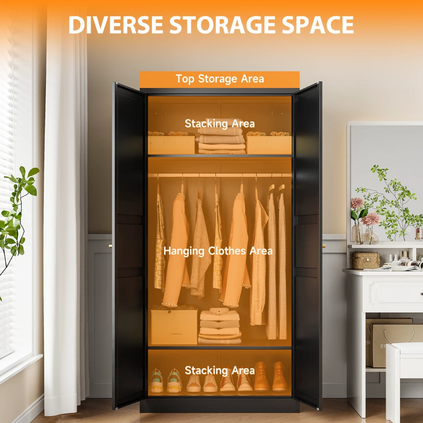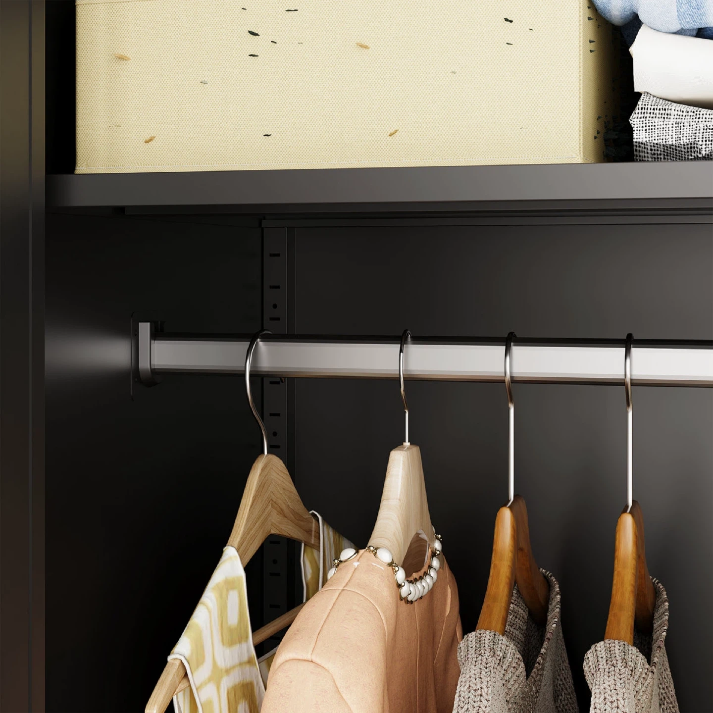 This black double door wardrobe offers ample storage with a hanging rail and shelves. It features adjustable feet for stability and magnetic door stoppers. A great addition for organizing clothes and shoes!