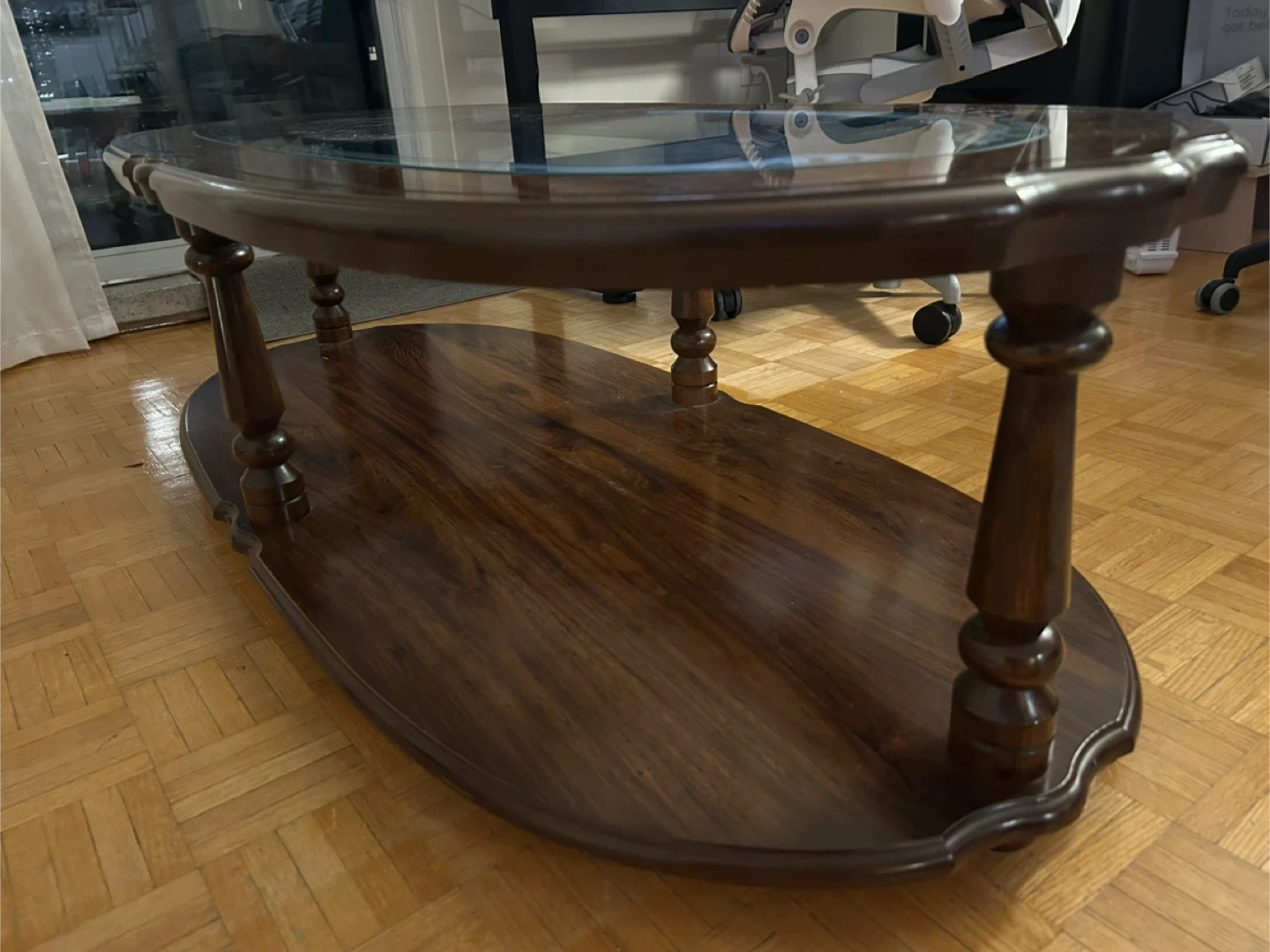Selling a lovely oval coffee table with a wood frame and glass top. It's in great shape and would be a perfect addition to any living room