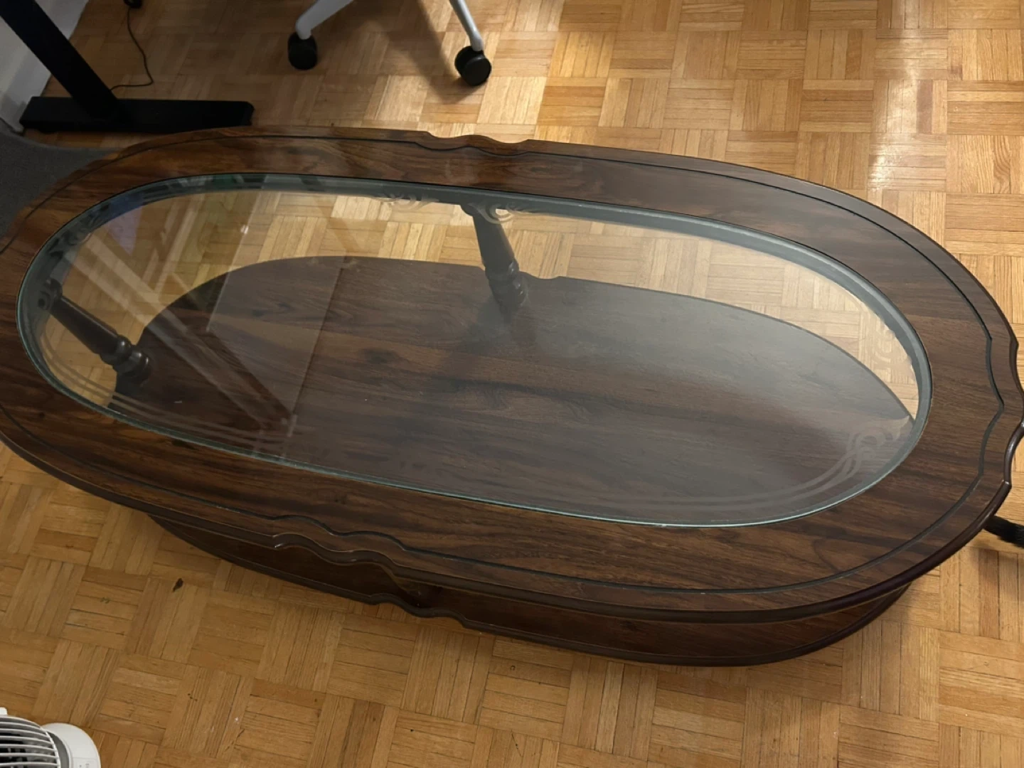 Selling a lovely oval coffee table with a wood frame and glass top. It's in great shape and would be a perfect addition to any living room