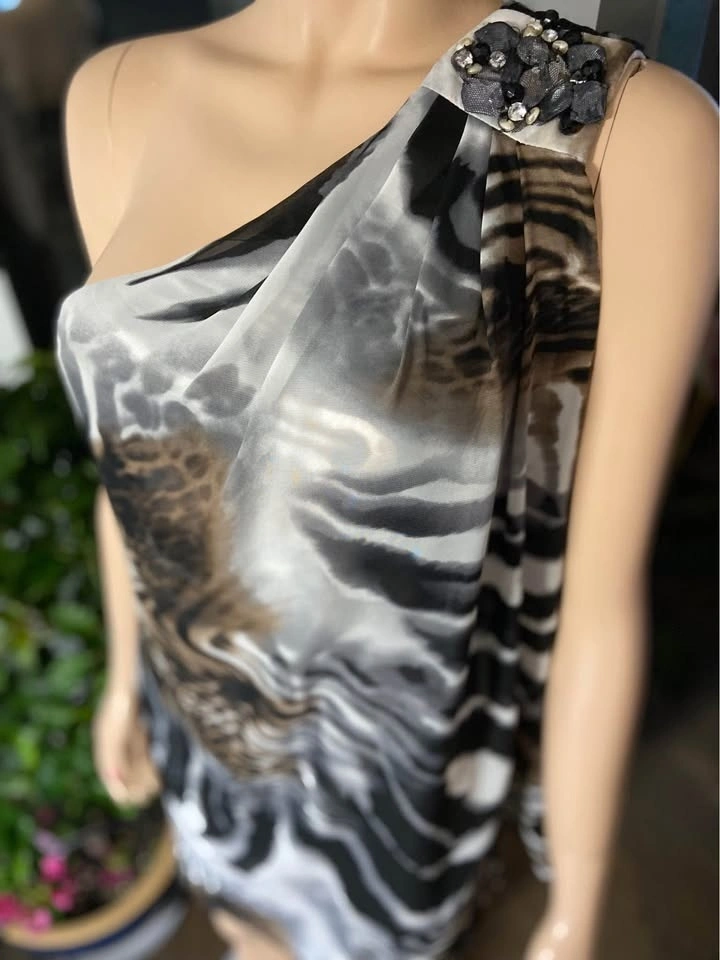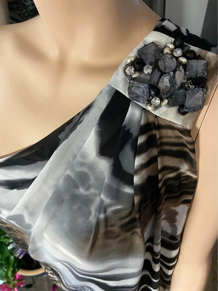 NWT: Onyx Nite Brown Chiffon Animal Print Embellished One-Shoulder Casual Dress (Size 2) 403