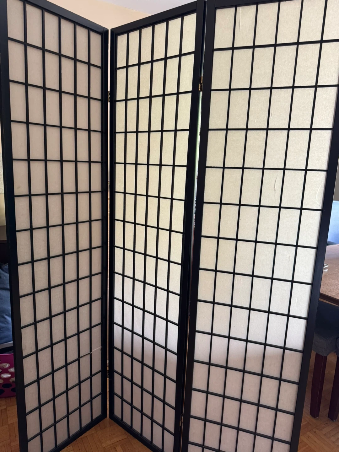 Selling a lovely room divider screen! It features a black wood frame with rice paper panels. It's perfect adding privacy or dividing a space in your home. It's lightweight and easy to move around too.