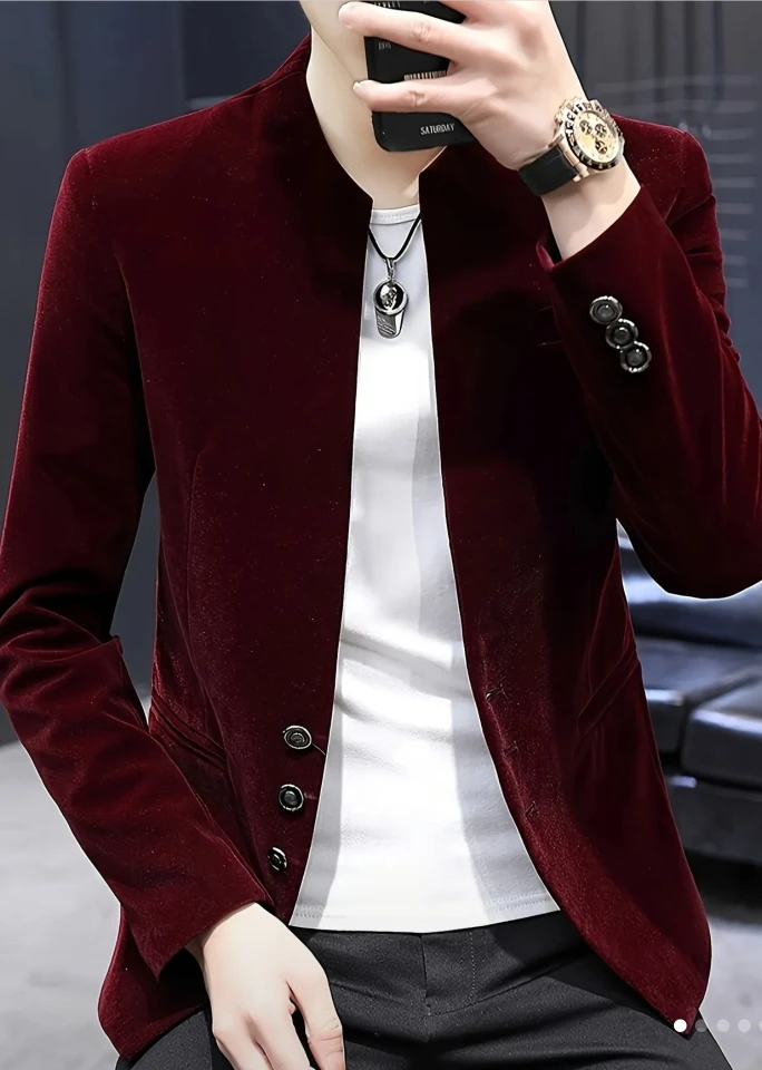Selling a stylish burgundy velvet blazer. It's in great condition and perfect for adding a touch of class to any outfit!