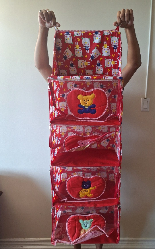This hanging organizer features 5 pockets with clear plastic windows, allowing you to easily see what's inside. The organizer has a fun and colourful design with a teddy bear theme. It is perfect for storing and organizing various items such as toys, clothes, and accessories. The organizer is lightweight and easy to hang from any hook