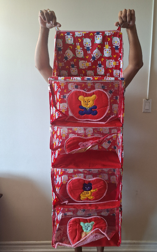 This hanging organizer features 5 pockets with clear plastic windows, allowing you to easily see what's inside. The organizer has a fun and colourful design with a teddy bear theme. It is perfect for storing and organizing various items such as toys, clothes, and accessories. The organizer is lightweight and easy to hang from any hook