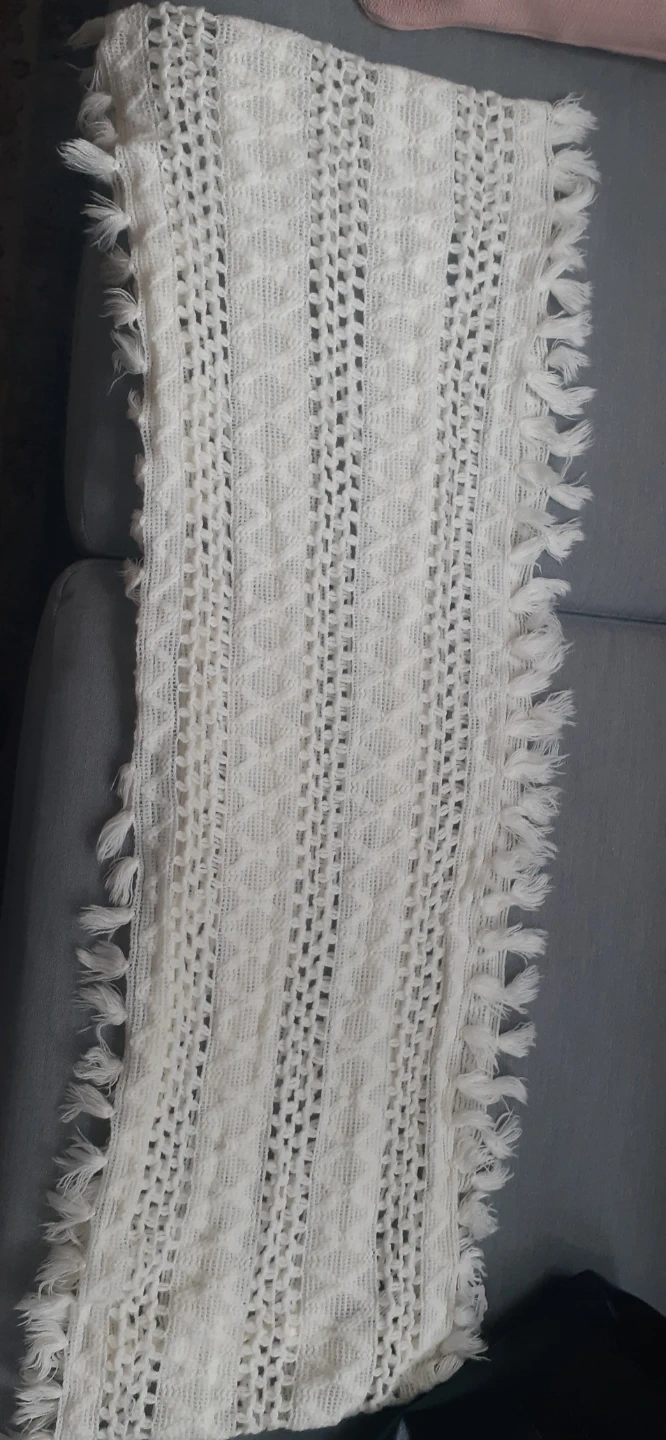 This is a white infinity woven scarf . It features a textured pattern with a fringe on both ends. It's approximately 13 inches wide and 70 inches long.