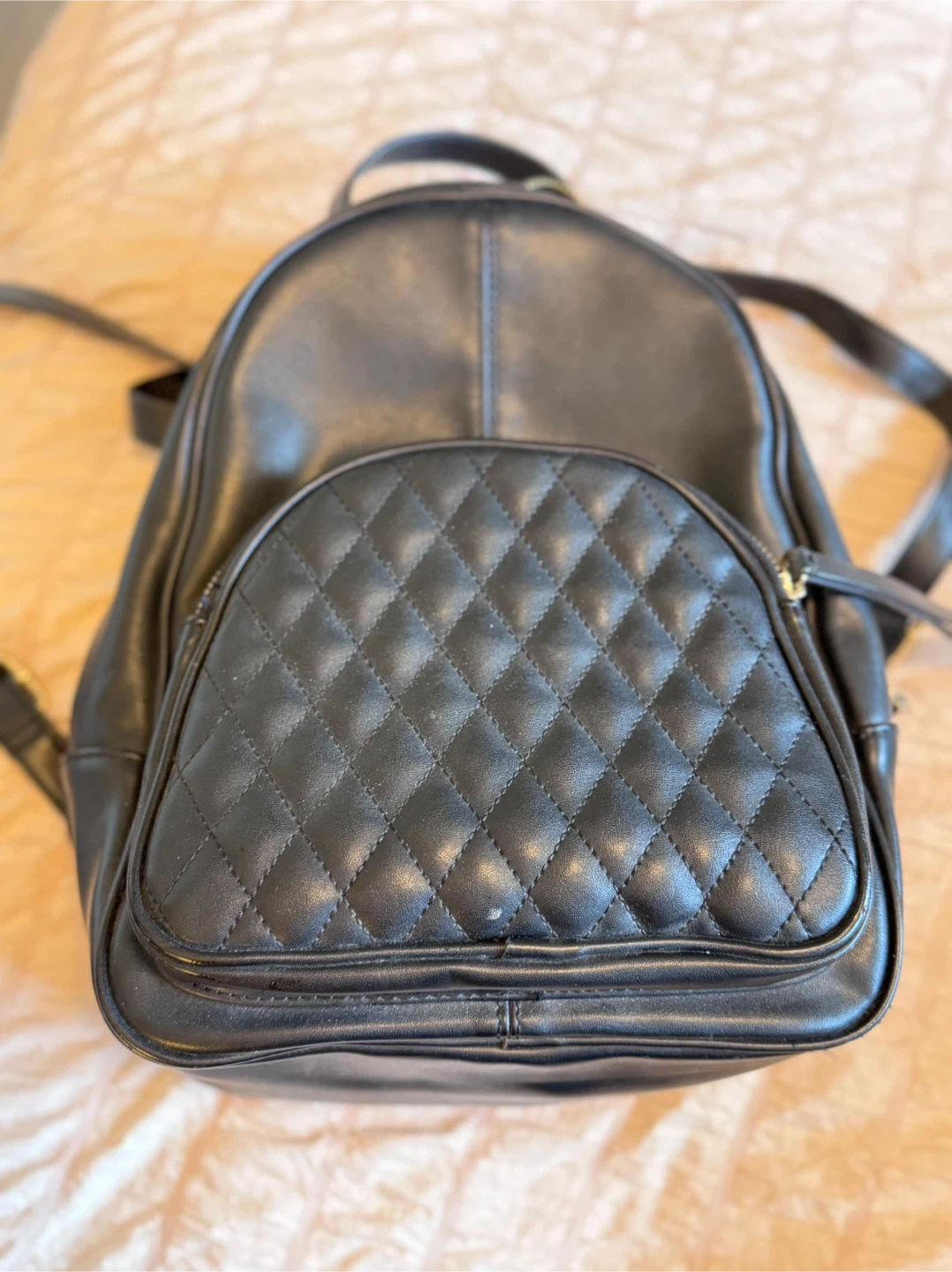 Cute and versatile black mini backpack from Call It Spring. Features a quilted front zip pocket, adjustable shoulder straps, and gold-tone hardware. Perfect everyday bag for errands, travel, or casual outfits.
