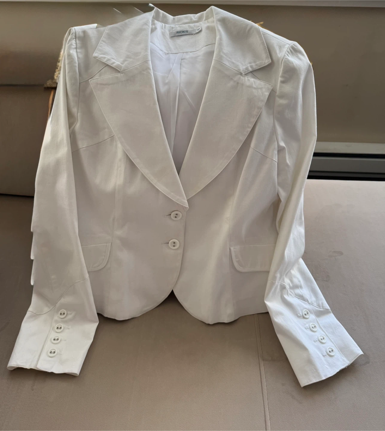 This is a white blazer from Ricki's. It features a single button closure and decorative buttons on the cuffs. The jacket has a structured collar and front flap pockets.