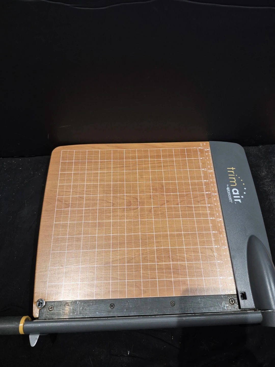 This Westcott Trim Air paper trimmer has a grid on the cutting surface for precise cuts. It features a durable metal bar, plastic base needs to be glued, but is included. Perfect for crafting and scrapbooking projects!