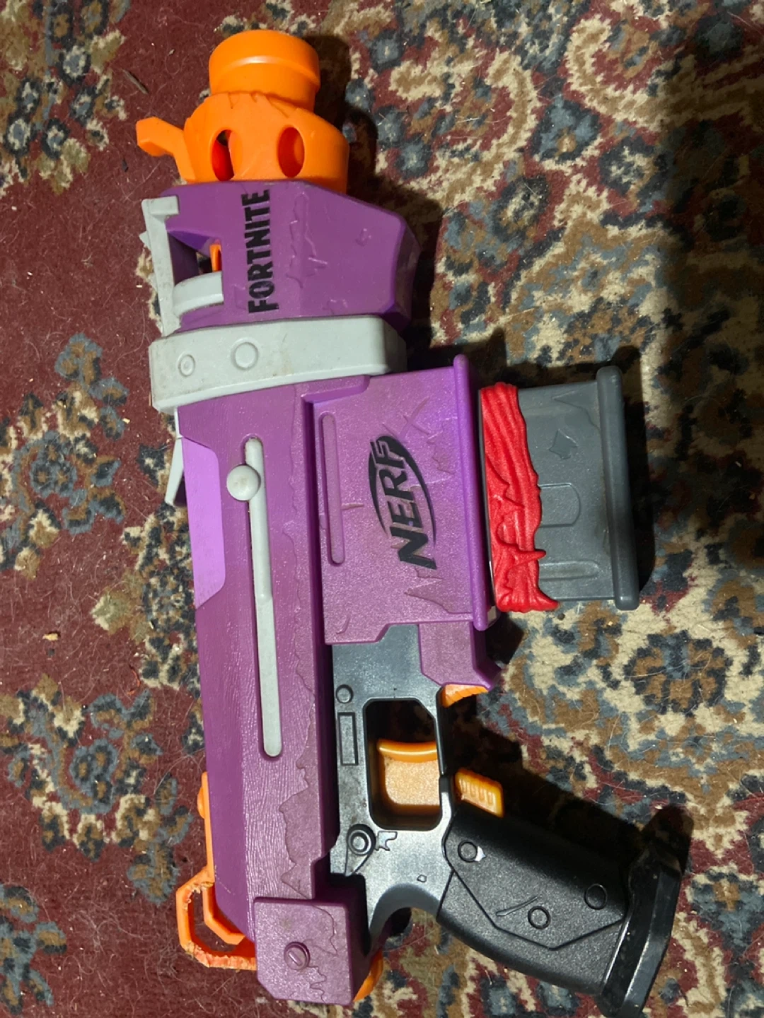 This is a Nerf Fortnite AR-L Elite Dart Blaster. It's purple and grey with orange accents and has the Fortnite branding on it. It includes the blaster, a magazine, and a top sight. It's a great toy for Fortnite fans!