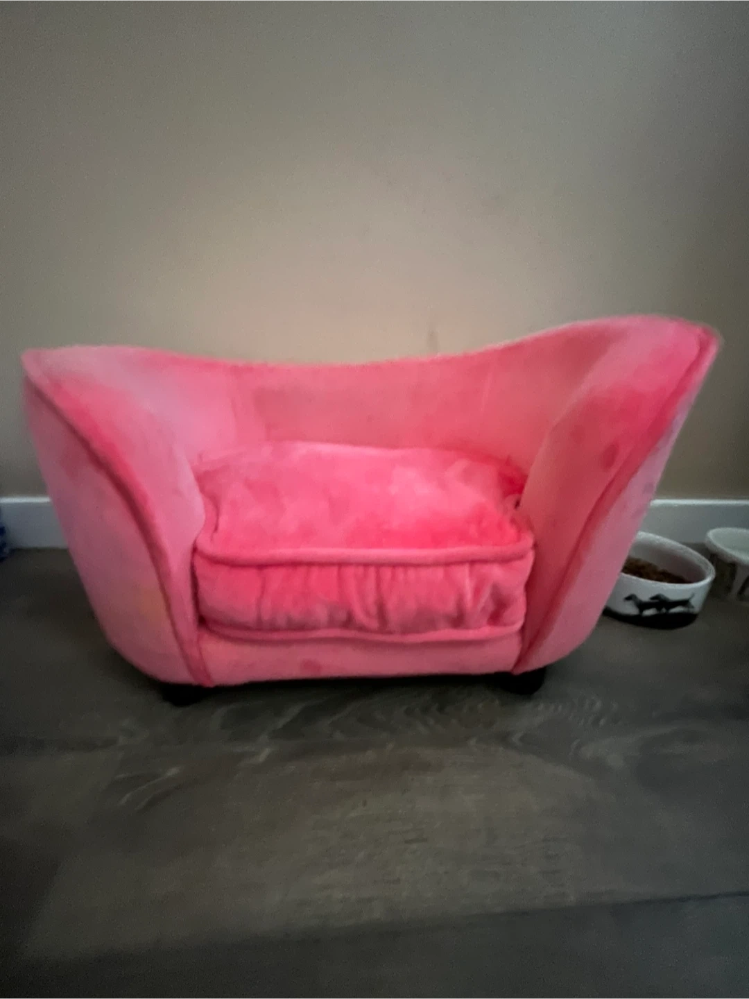 Comfy pink pet sofa. It's upholstered in a soft, plush material. Suitable for small dogs or cats. Your pet will love lounging in this adorable mini sofa! Needs some TLC cushion cover is washable-zips off