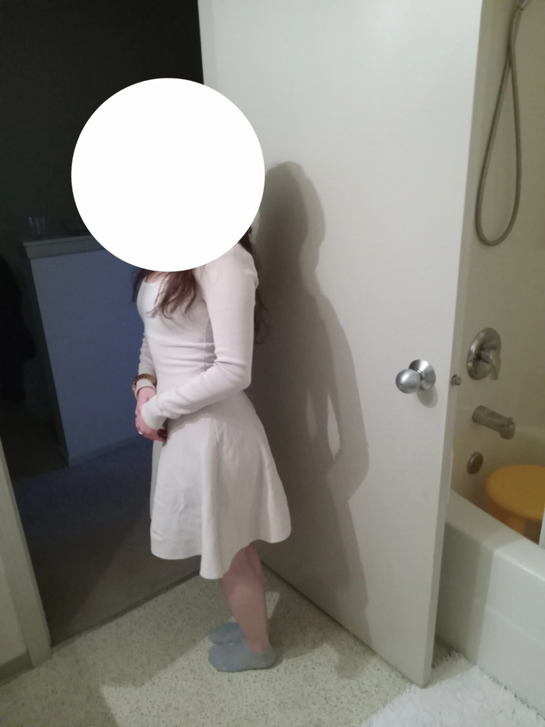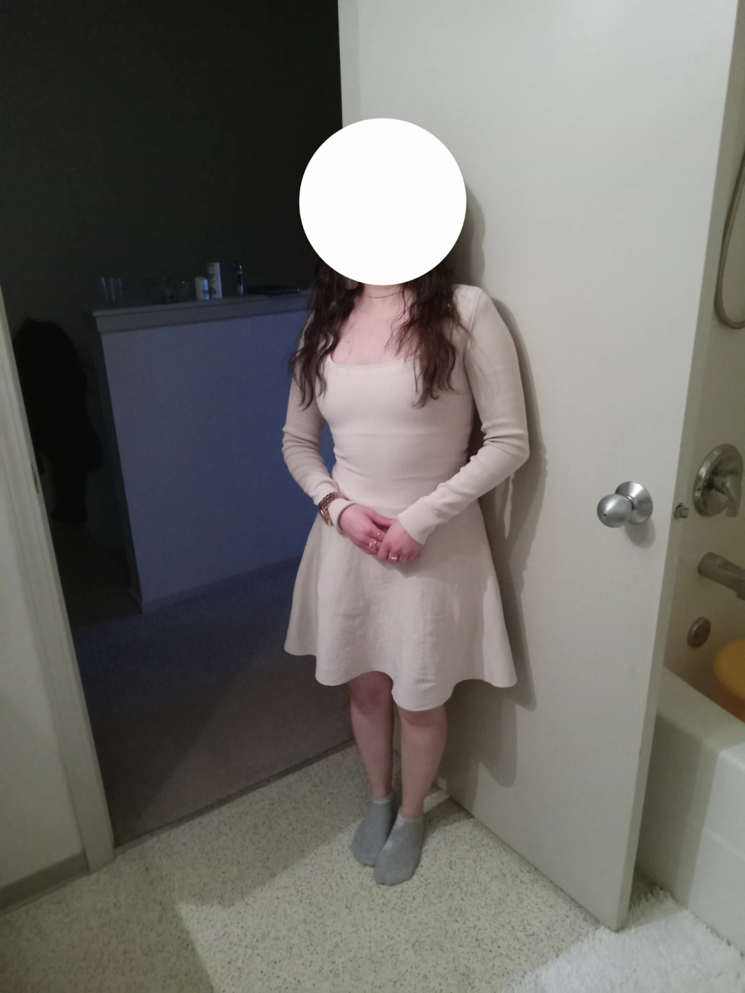 Long sleeve, knee-length skater dress. Off-white or cream colour. Simple, elegant design. Good for casual or semi-formal occasions.