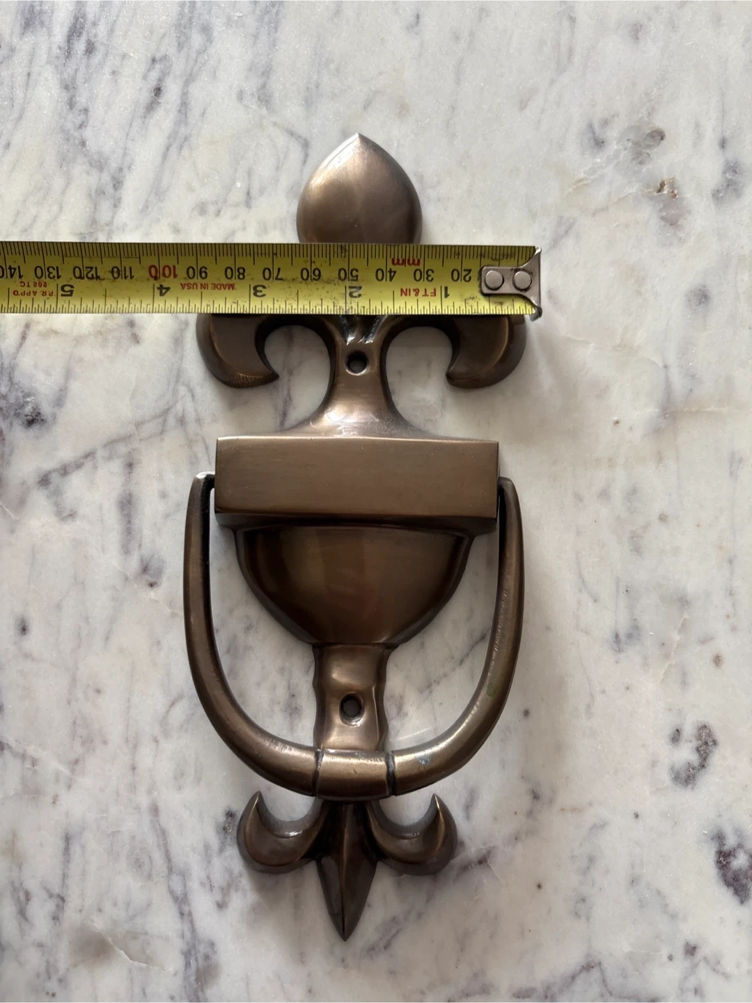 Selling a beautiful vintage bronze door knocker with a fleur-de-lis design. It's in great shape and would add a touch of elegance to any front door. The knocker measures approximately 8 inches in length.