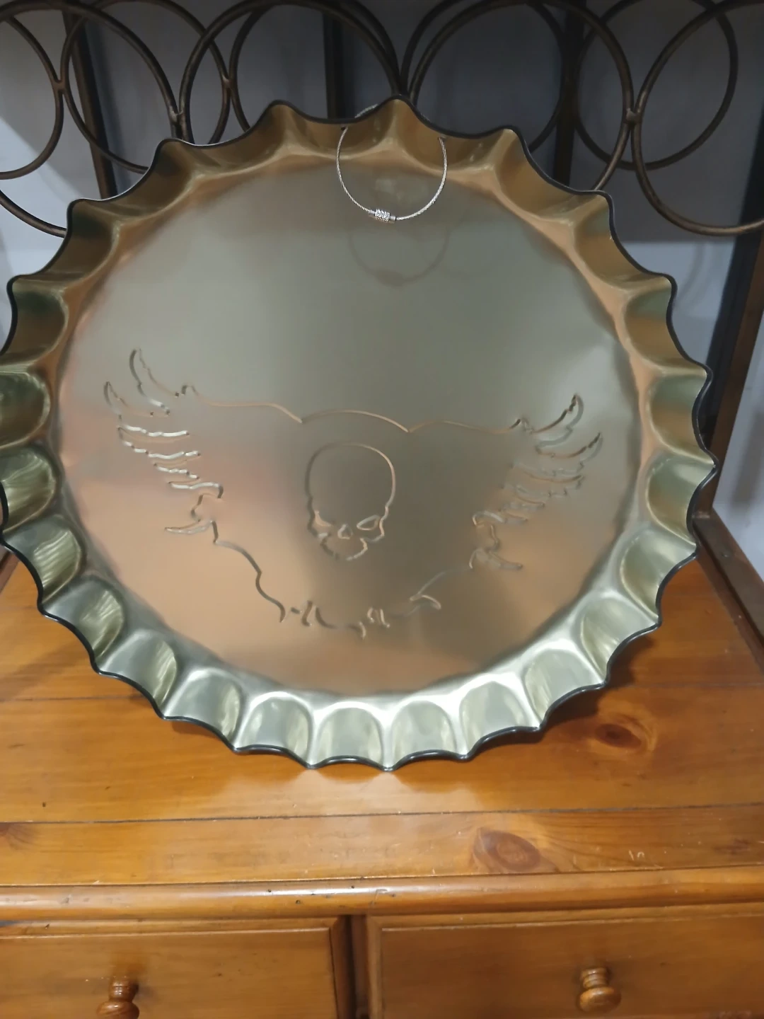 Cool Harley-Davidson wall decor shaped like a bottle cap! It features the classic Harley-Davidson logo with the skull and wings design. Perfect for adding some edge to your space
