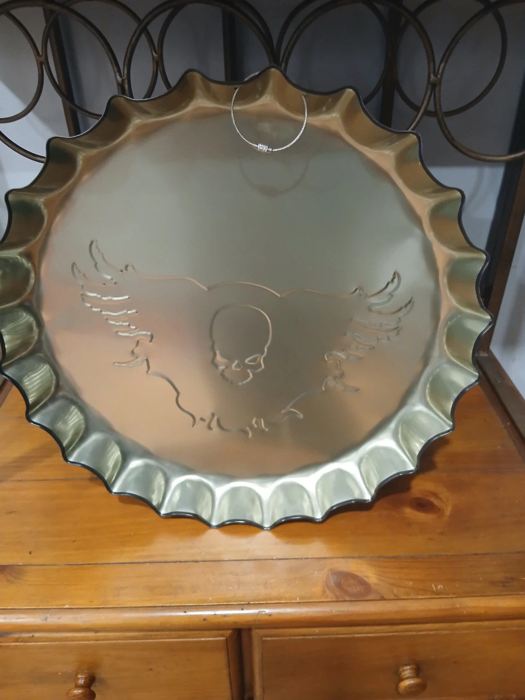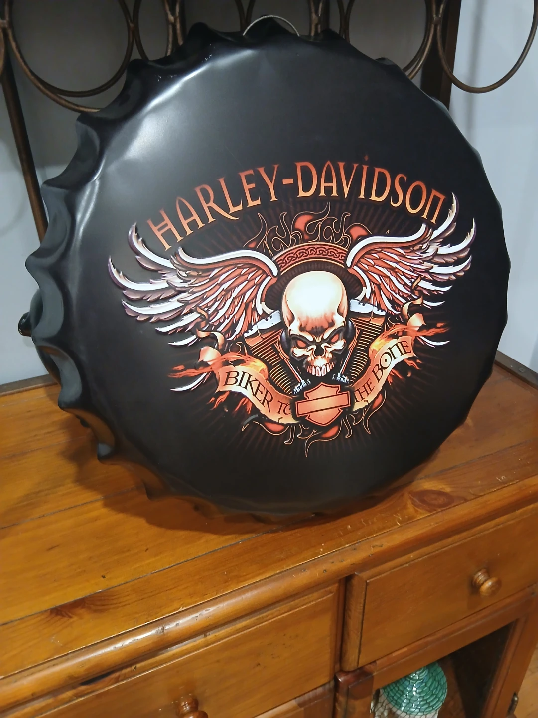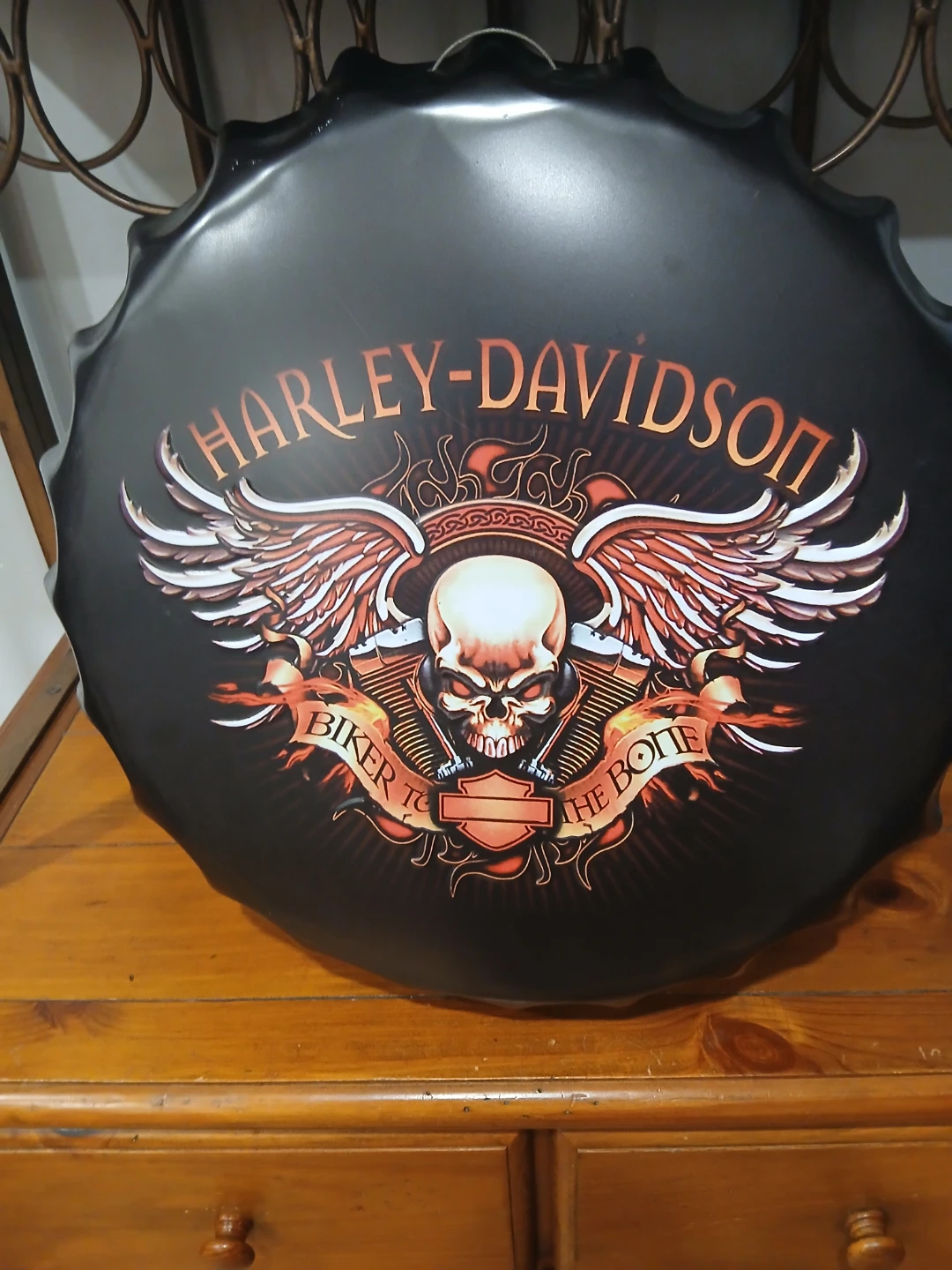 Cool Harley-Davidson wall decor shaped like a bottle cap! It features the classic Harley-Davidson logo with the skull and wings design. Perfect for adding some edge to your space