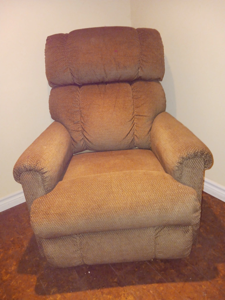 Brown recliner chair. Cushioned back and arms. Pull lever to recline. Use this chair as a comfortable spot to relax and unwind after a long day.