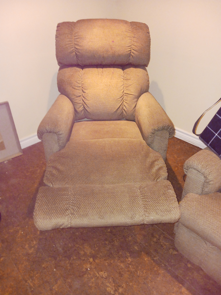 Brown recliner chair. Cushioned back and arms. Pull lever to recline. Use this chair as a comfortable spot to relax and unwind after a long day.