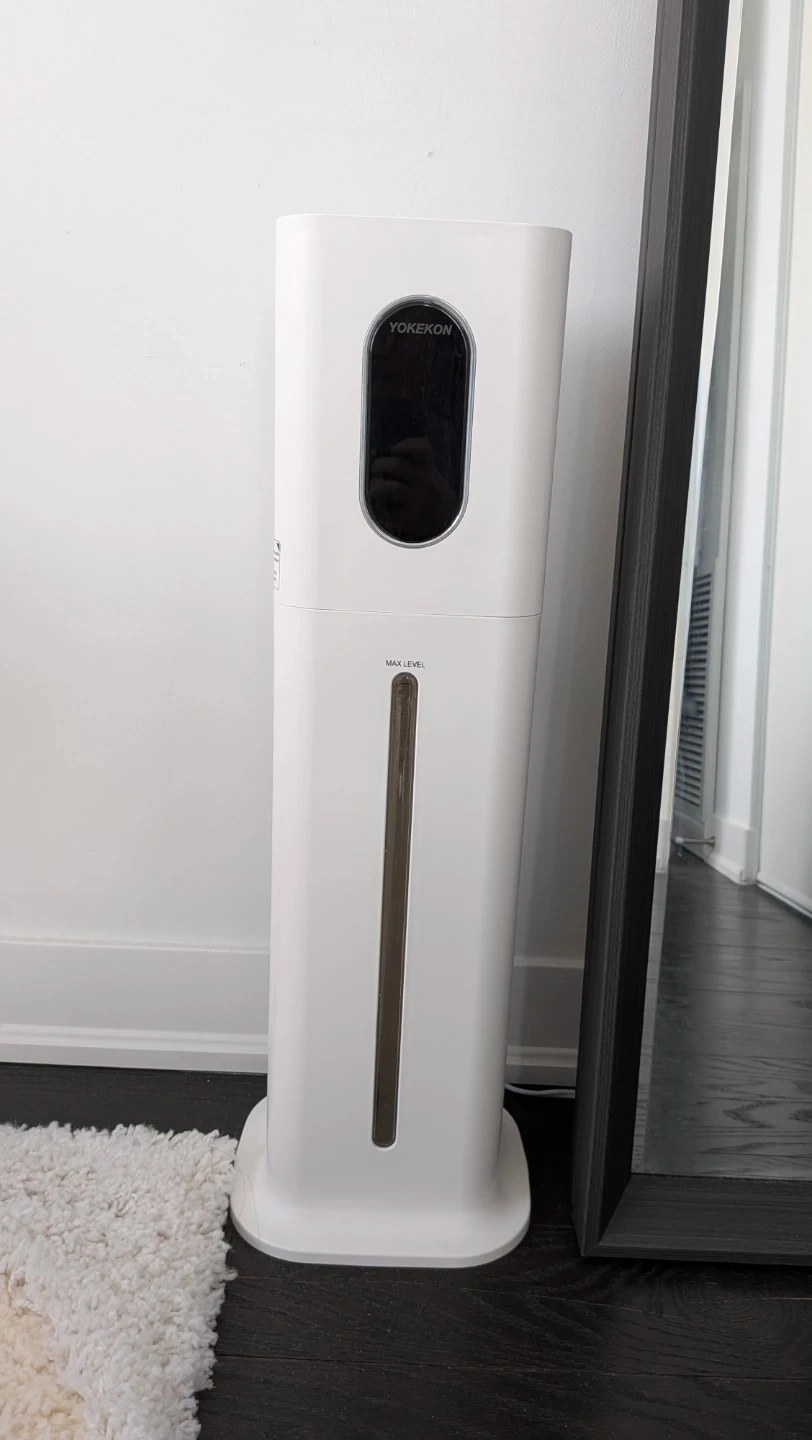 This is a white YOKEON humidifier. It has several control buttons on top including power, sleep, timer, and humidity settings. The water level is visible through a clear strip on the front.