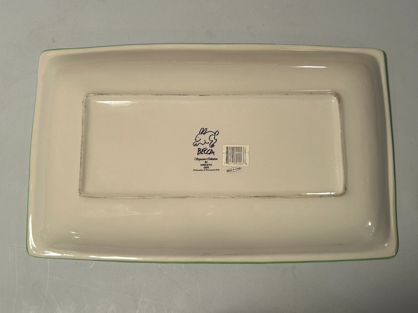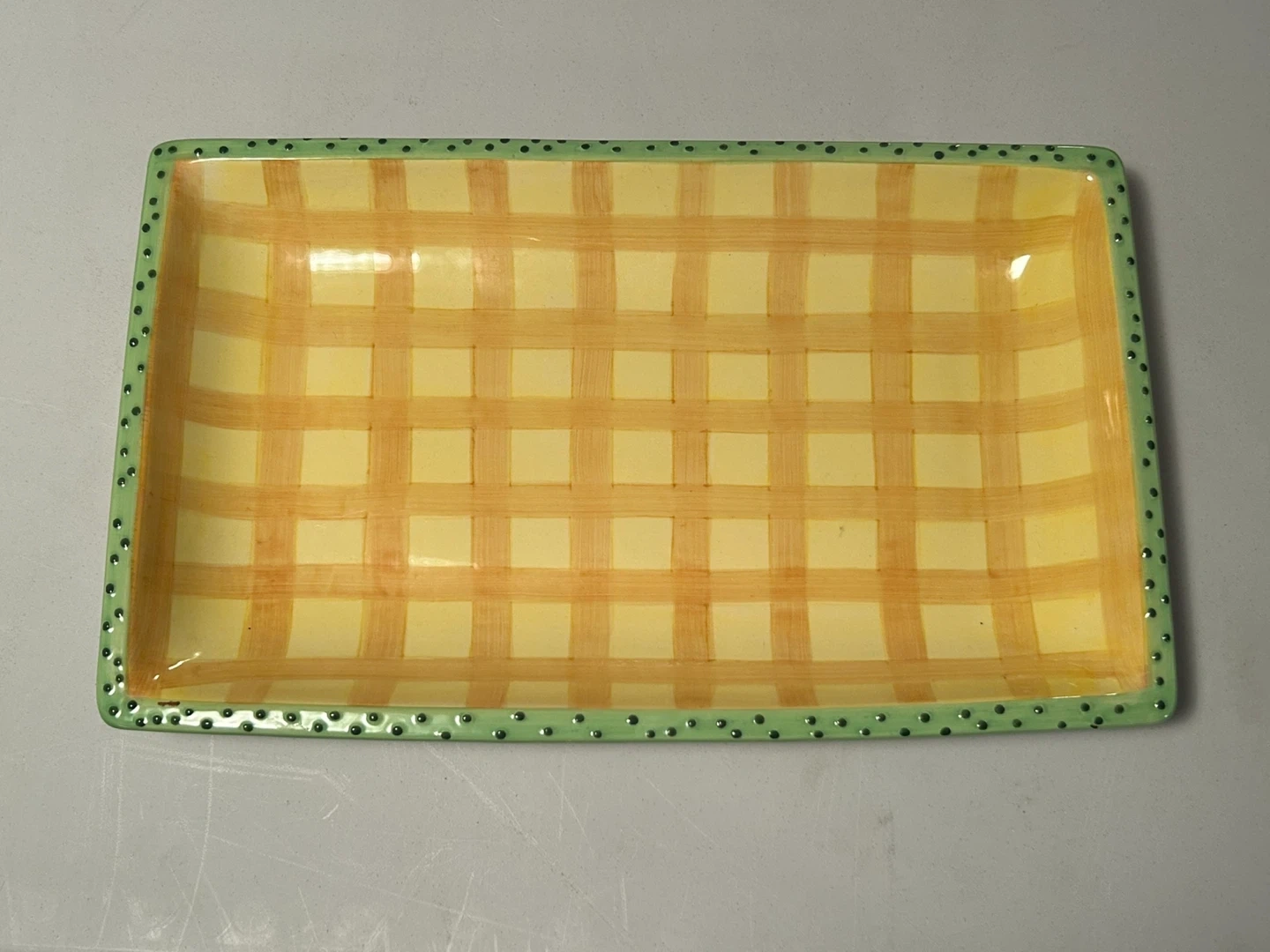 This serving platter features a yellow checkered design with a green rim. It's made of ceramic. This dish is great for serving snacks or appetizers at your next get-together!