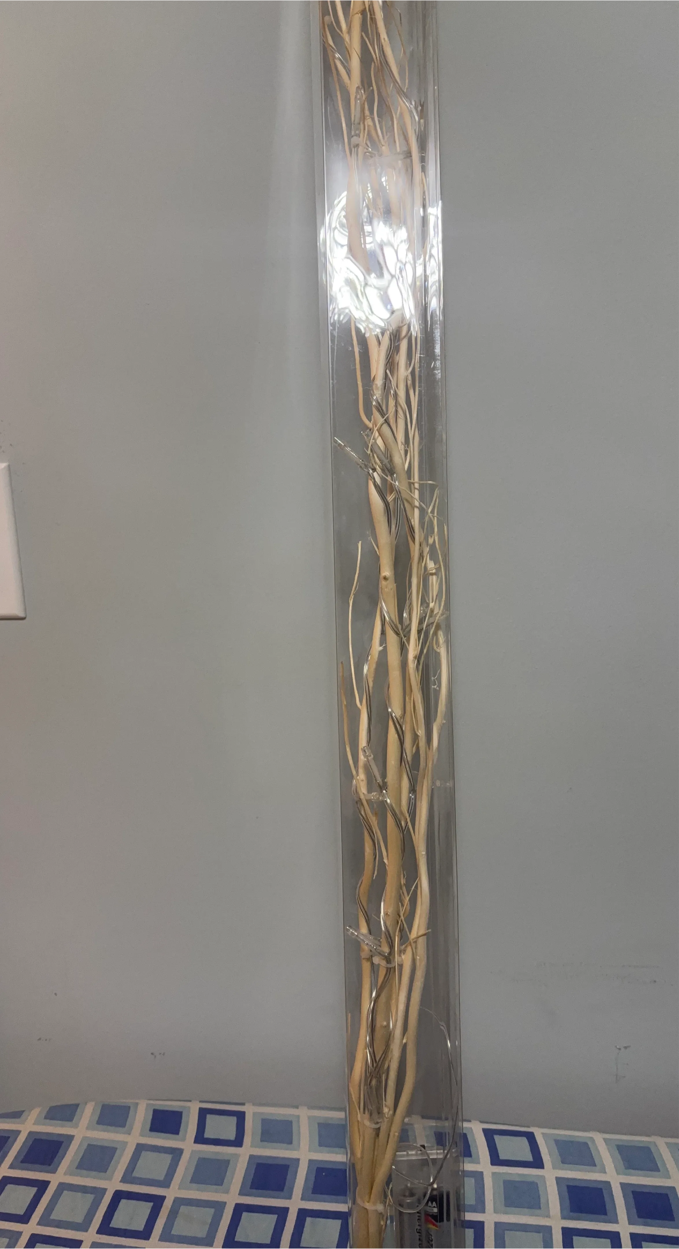 This decorative piece features natural branches encased in a clear cylinder. Built-in lights add a warm glow. It's a unique accent for any room. Operated by AA batteries.