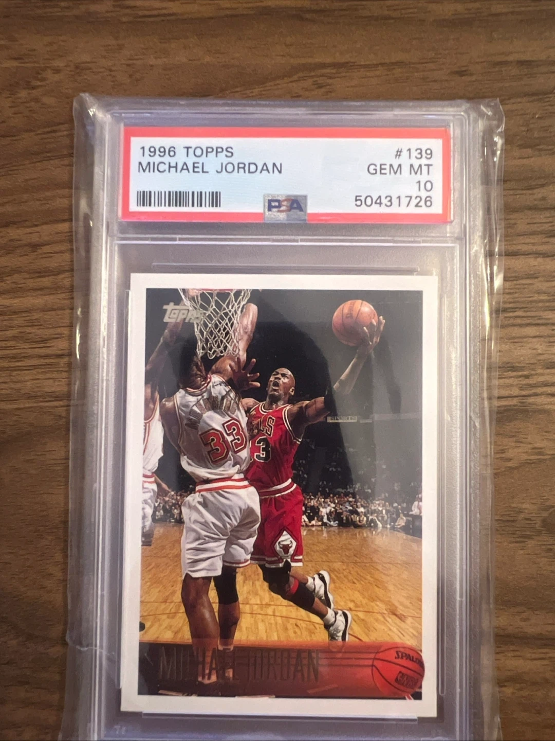 This is the 1996 Topps Michael Jordan basketball card, graded PSA 10 Gem Mint. It's card #139 from the set. This card is a must-have for any serious collector!