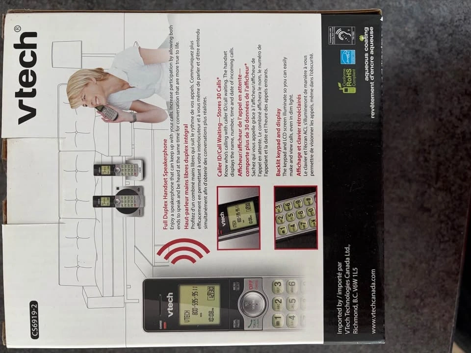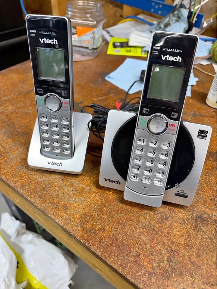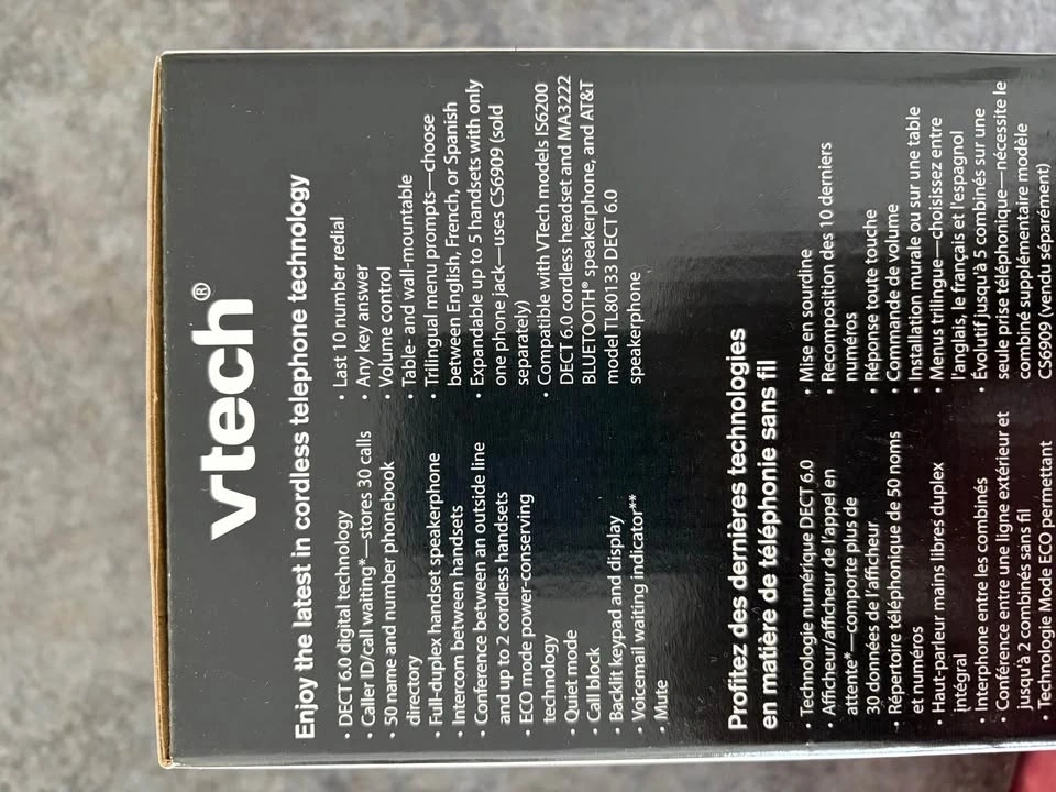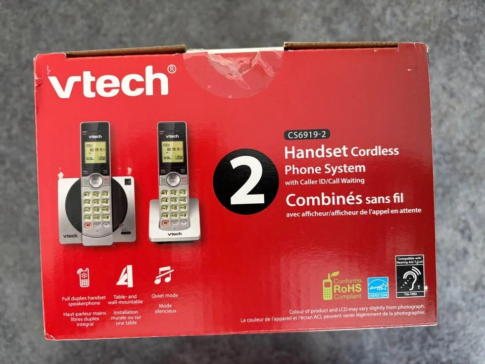 Vtech DECT 6.0 Two handsets cordless phone system with 30 name/number caller ID (with 20 call block) and 50 phonebook memory. Features call block to prevent unwanted callers, handset speakerphones with backlit keypads and displays, and intercom capability. Comes in original box.