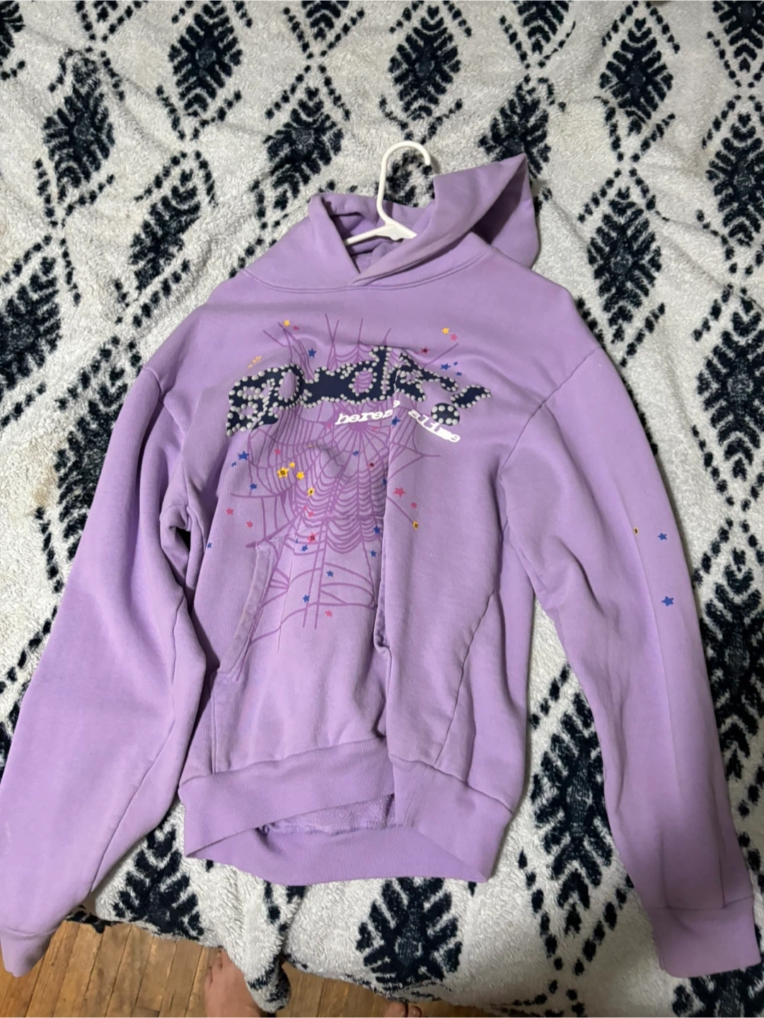 This is a lavender Barrow hoodie with a spiderweb graphic on the front and scattered stars on the back. It's a pullover style with a hood and front pocket. Made of a soft cotton blend.