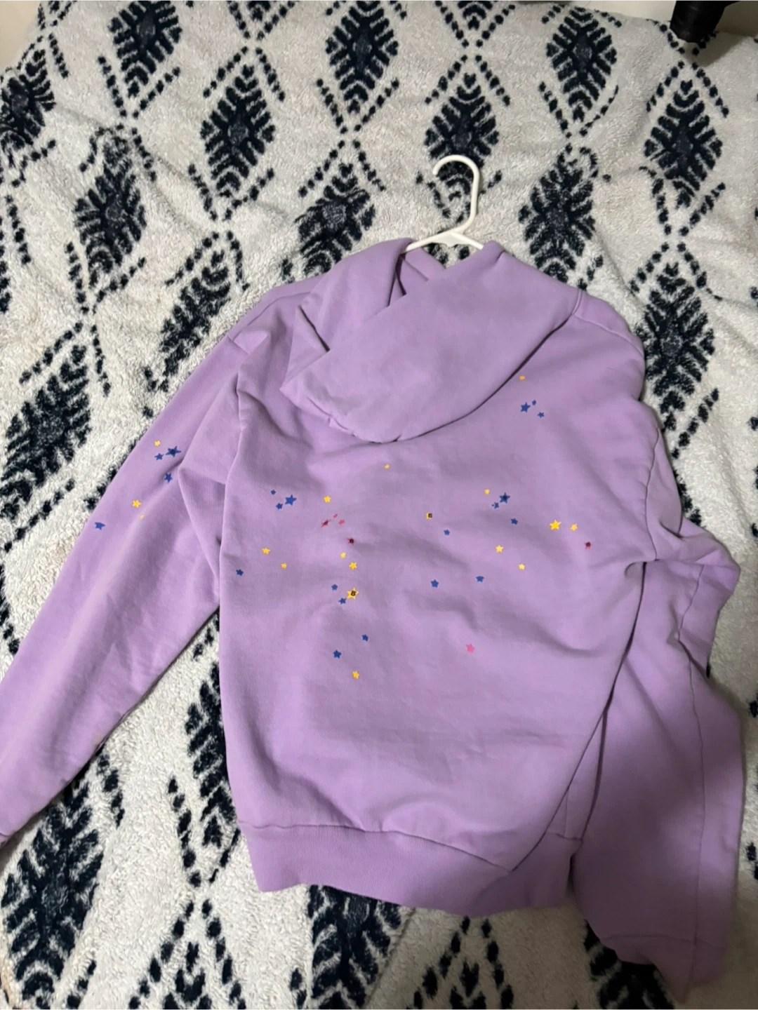 This is a lavender Barrow hoodie with a spiderweb graphic on the front and scattered stars on the back. It's a pullover style with a hood and front pocket. Made of a soft cotton blend.