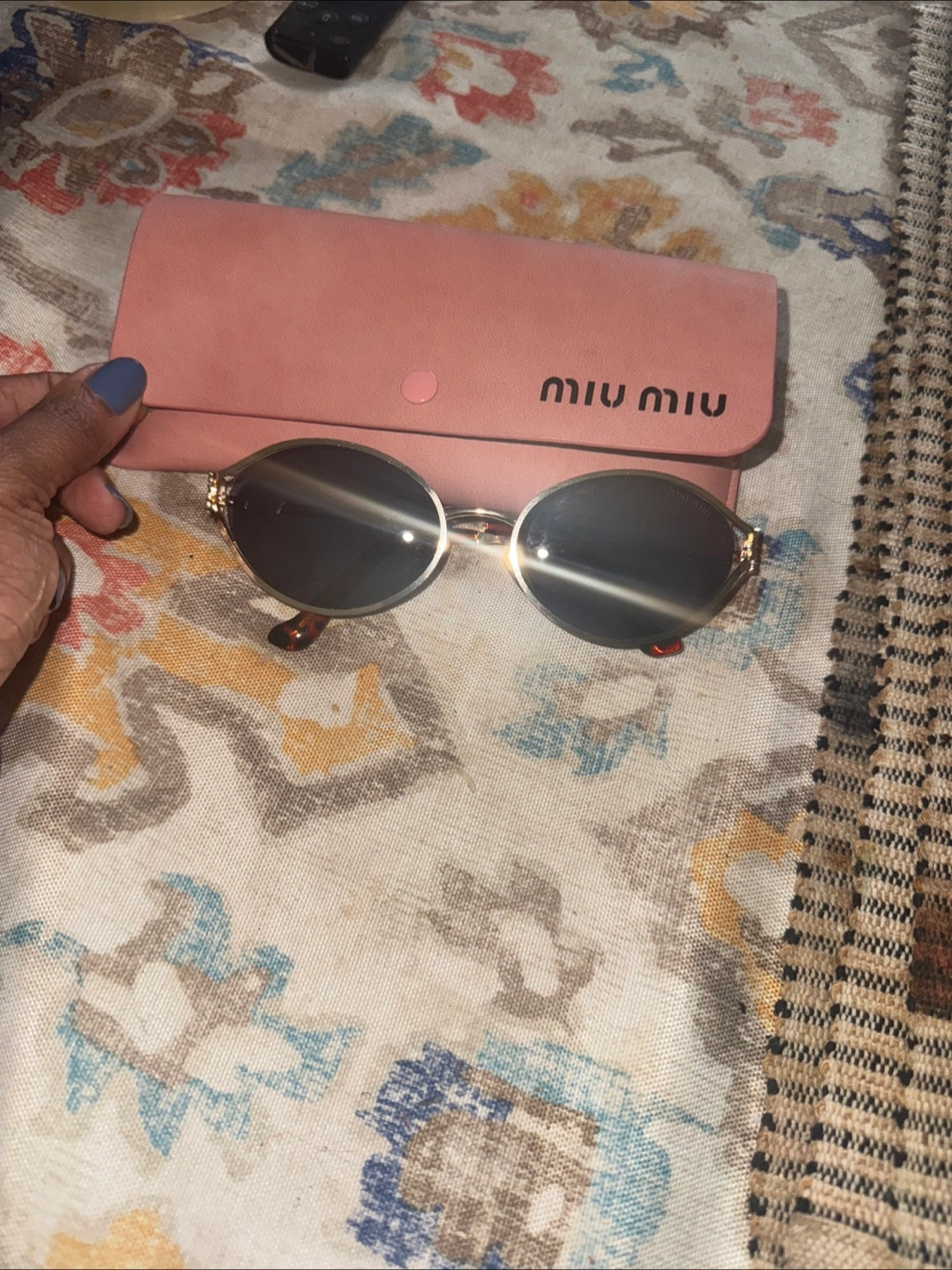 These Miu Miu sunglasses feature a gold-tone metal frame and dark lenses. They come with a pink protective case. These are a stylish accessory for sunny days!