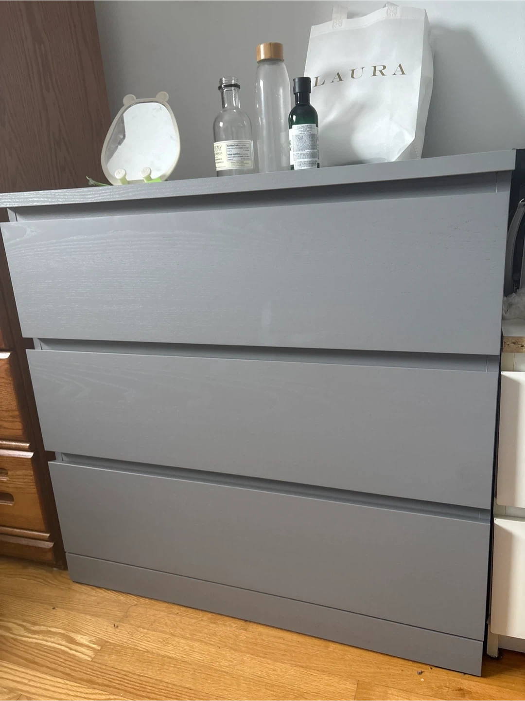 Selling a 3-drawer dresser in a modern grey finish, offers ample storage space for clothes or other items. The drawers slide smoothly and is in perfect working condition. Price negotiable!
