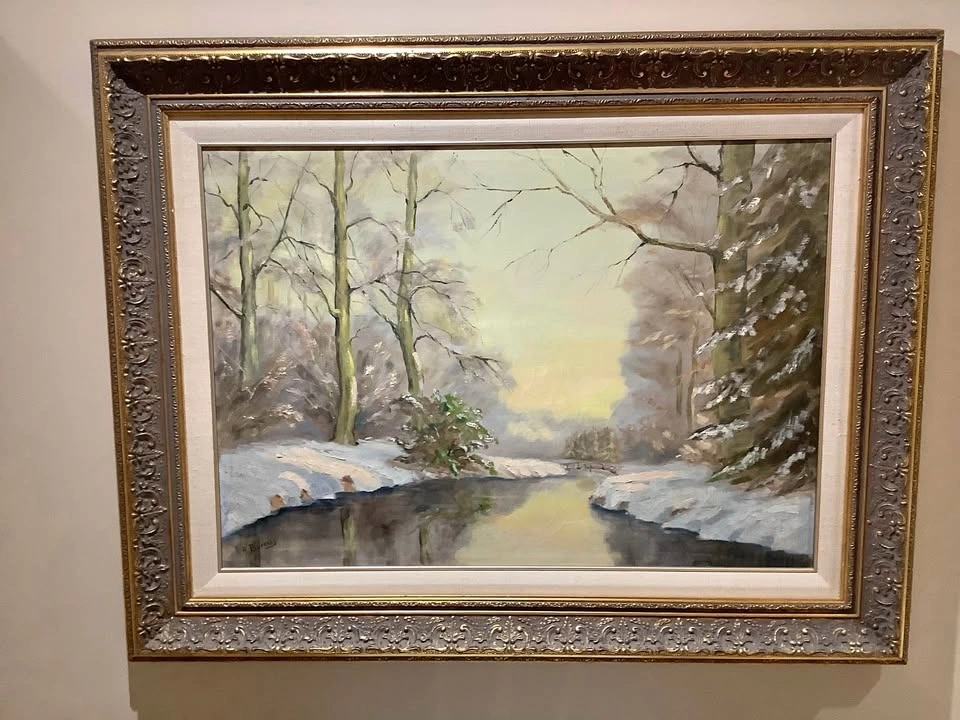 Beautiful oil painting featuring a serene winter landscape. It comes in a 36” x 28” gilded wood frame. Feel free to message if you have any questions!
