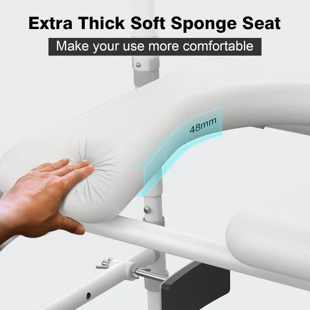 This seat is adjustable in height from 16.5" to 22.5" to fit most toilets. It features a super comfortable, soft padded seat, unlike hard plastic ones. The durable metal frame supports up to 400 lbs. It includes non-slip, water-resistant handles for enhanced safety and a secure grip. This item is multi-functional and can also be used as a shower chair. The frame is rust-proof and the padding is stain-resistant.
