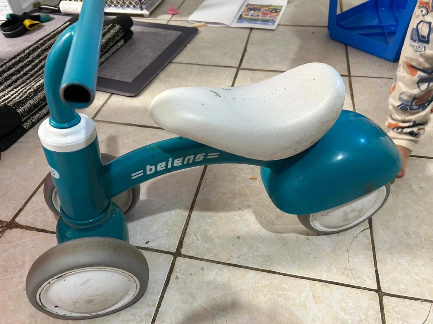 This is a teal Bains balance bike. It's a four-wheeled toddler bike designed for learning to balance. The bike is made of durable plastic and metal components.