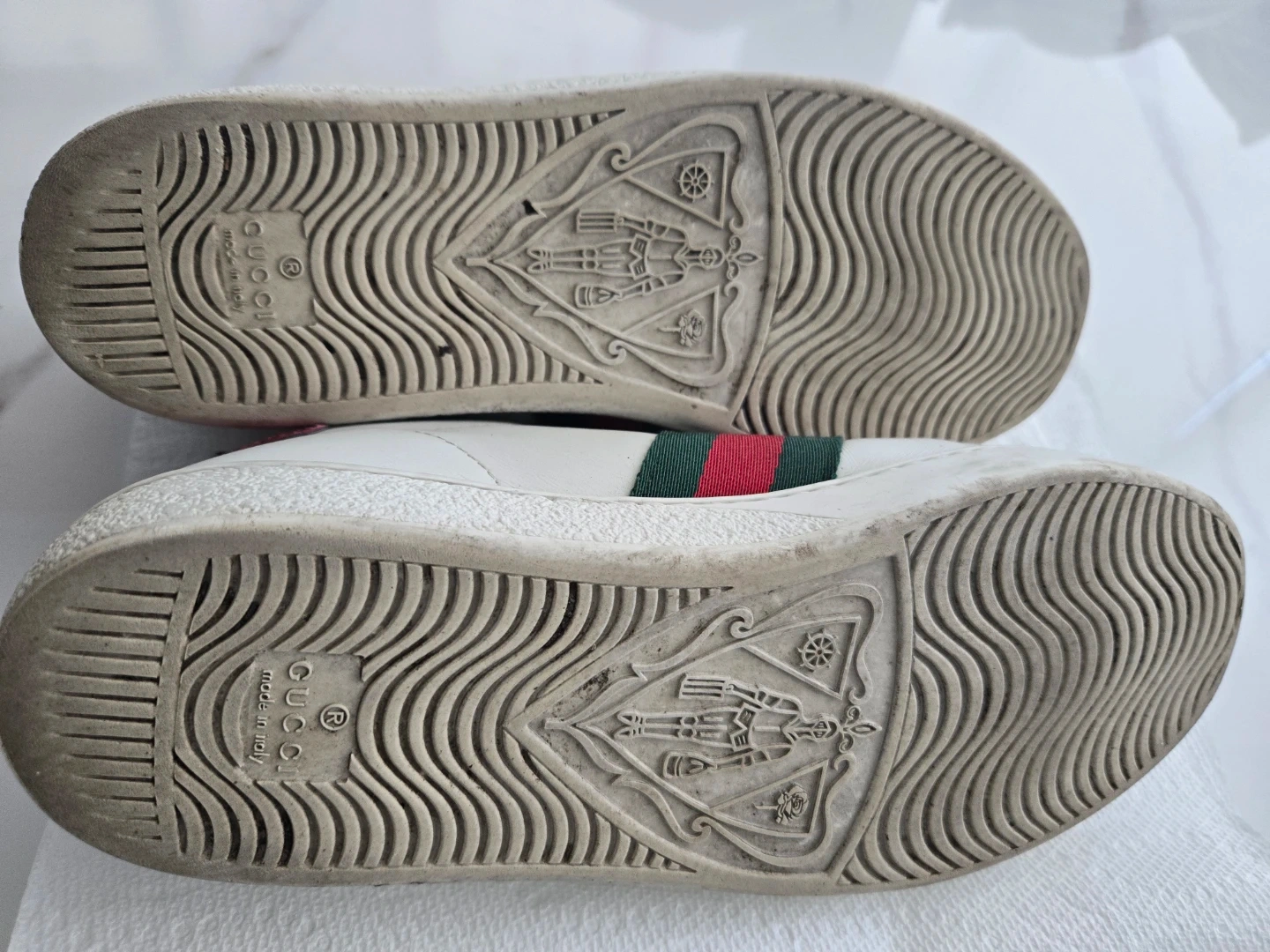Authentic Gucci white leather sneakers with red and green stripe detailing and embroidered bee. Features contrasting metallic red and green snakeskin accents on the heels. Made in Italy.