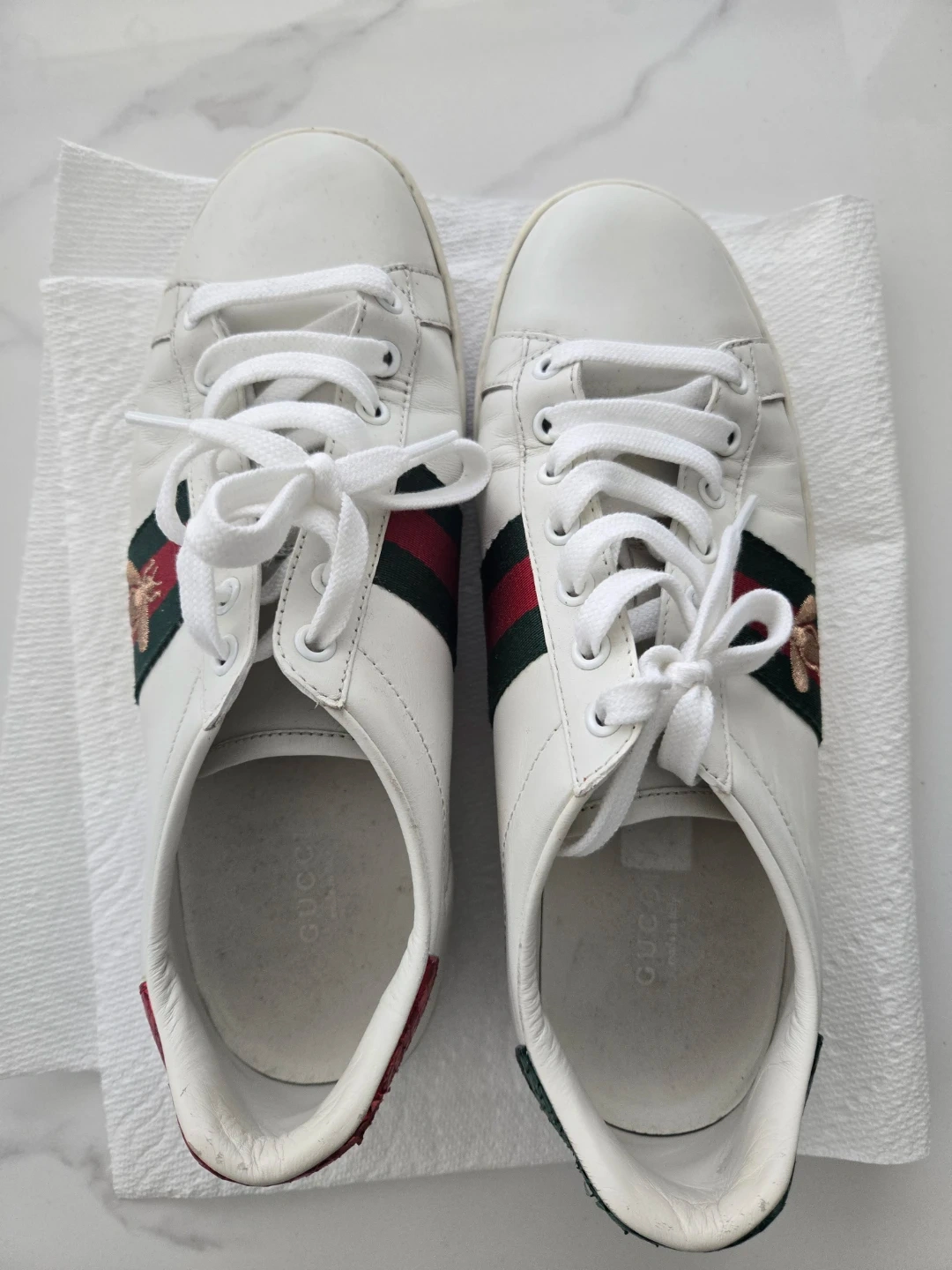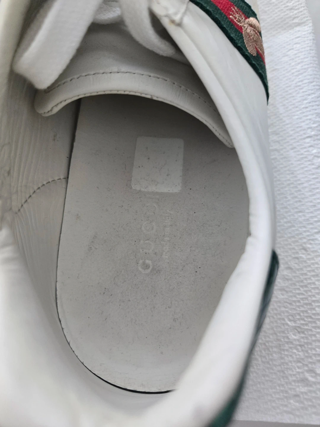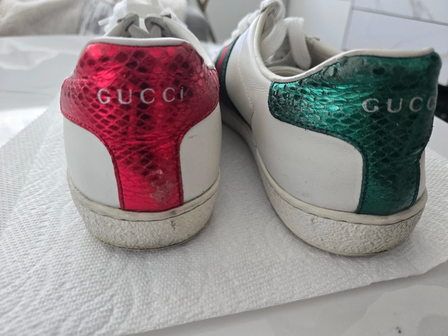 Authentic Gucci white leather sneakers with red and green stripe detailing and embroidered bee. Features contrasting metallic red and green snakeskin accents on the heels. Made in Italy.