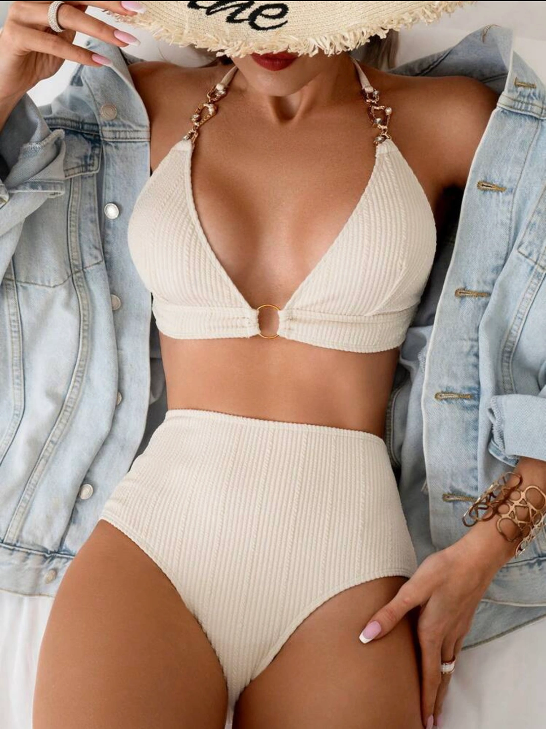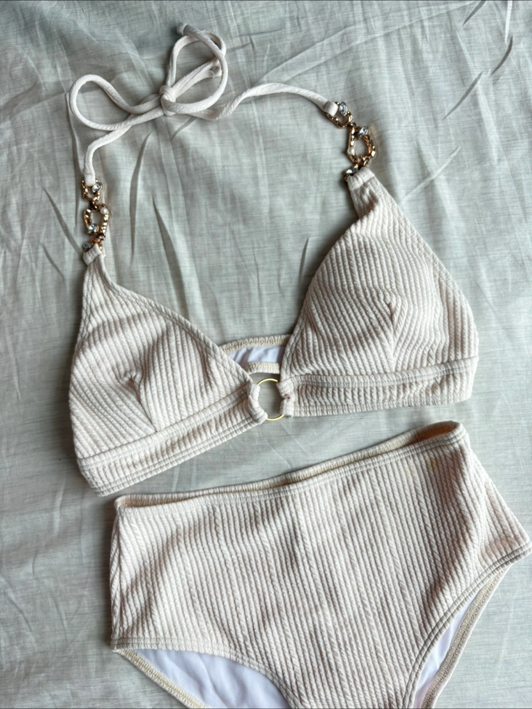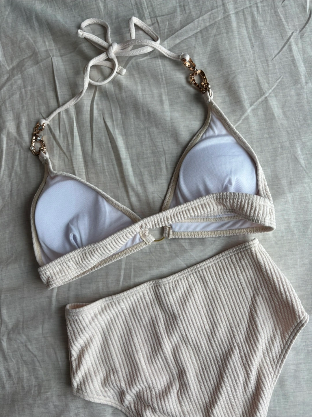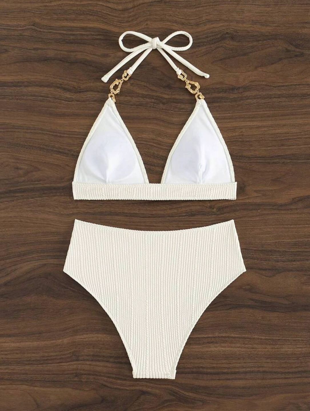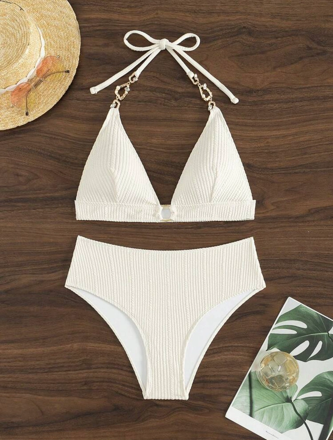 Textured Halter Neck Two Piece Bikini Swimsuit Set-Beige